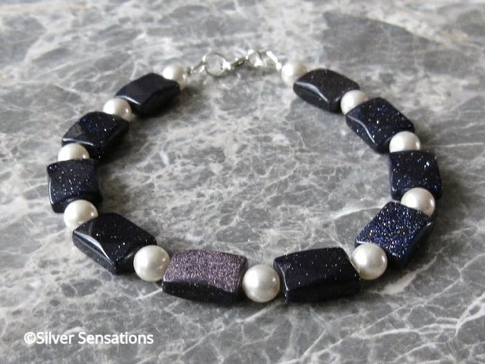 Sparkly Navy Blue Goldstone & White Swarovski Pearls Bracelet