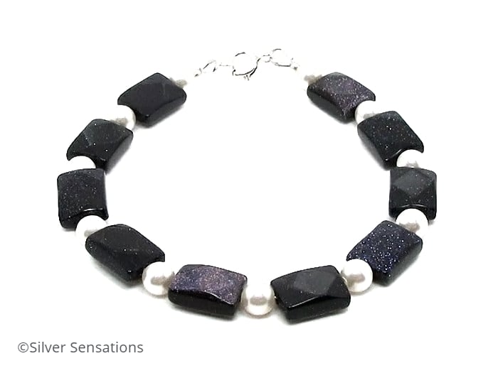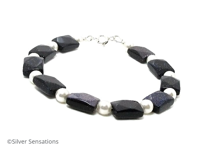A striking navy blue & white ladies handmade bracelet with sparkly faceted Blue Goldstone oblong beads & beautiful white Swarovski Pearls from the Swarovski Elements range.