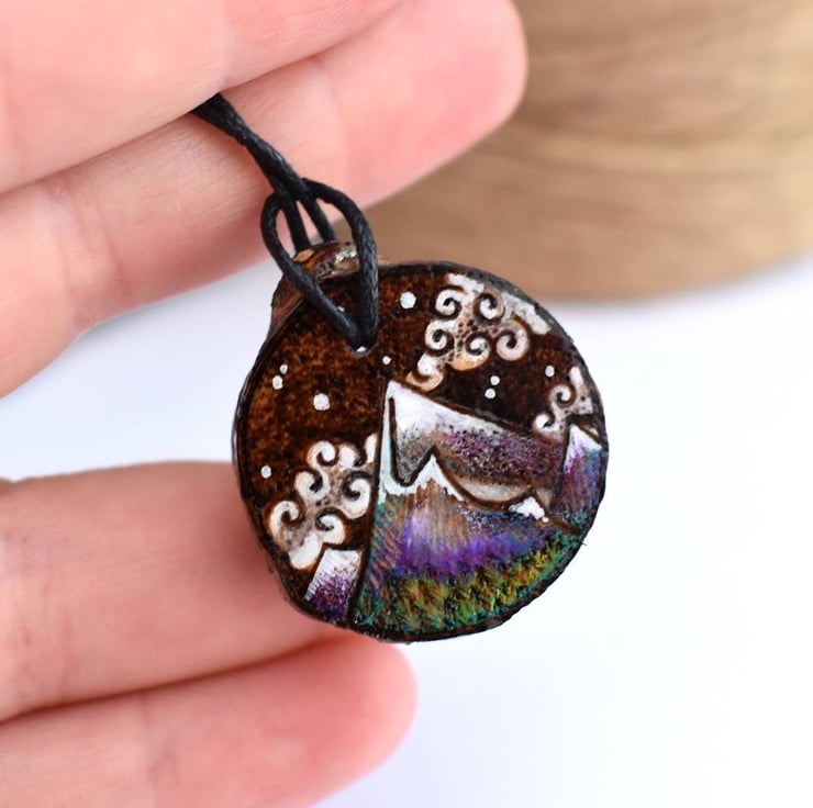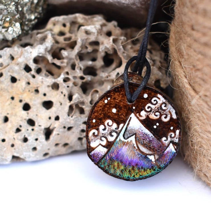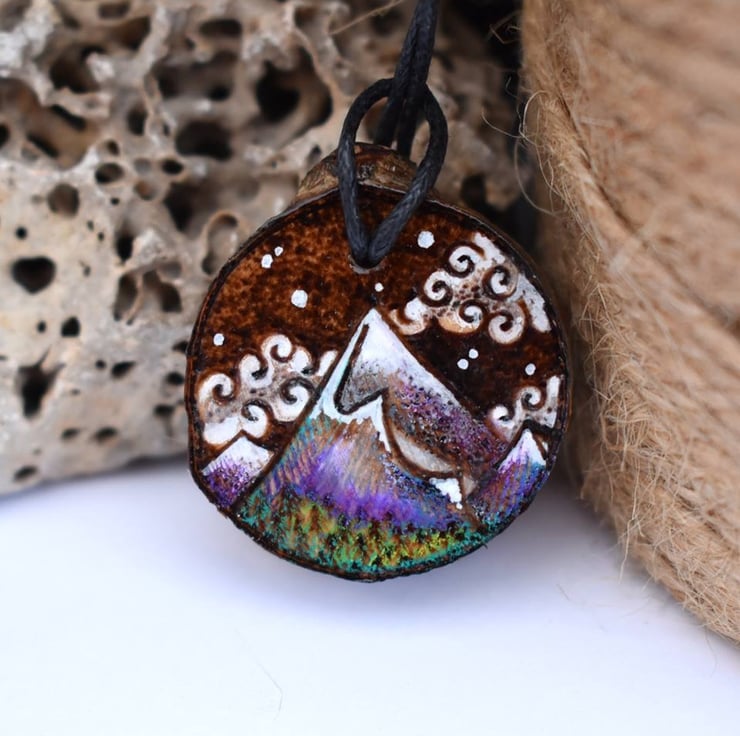 A hand burned rustic pendant, with a snow capped mountain. This is one of my smaller, lightweight pieces. Ideal for a nature lover, walker or rambler. A lovely gift for a birthday, or for a five year wood anniversary.