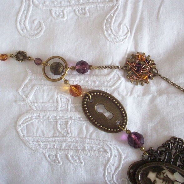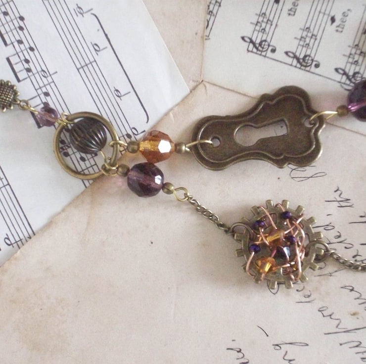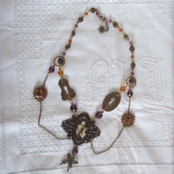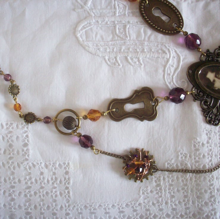 Fabulous statement piece with vintage plum and amber glass beads. The moody young poet depicted in sepia looks out at you from an ornate bronzey coloured frame with a butterfly and bead drop. The image is protected by resin. Wirewrapped gears and sunflower charms complete the chain. The followers of the Aesthetic movement, Oscar, James Macneil Whistler and all that end of century (the 19th) gang loved the sunflower so much so that they were parodied in Punch holding it. Quite "Greenery Yallery, Grosvenor Gallery" my dear as the quote goes.