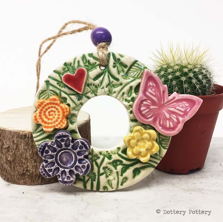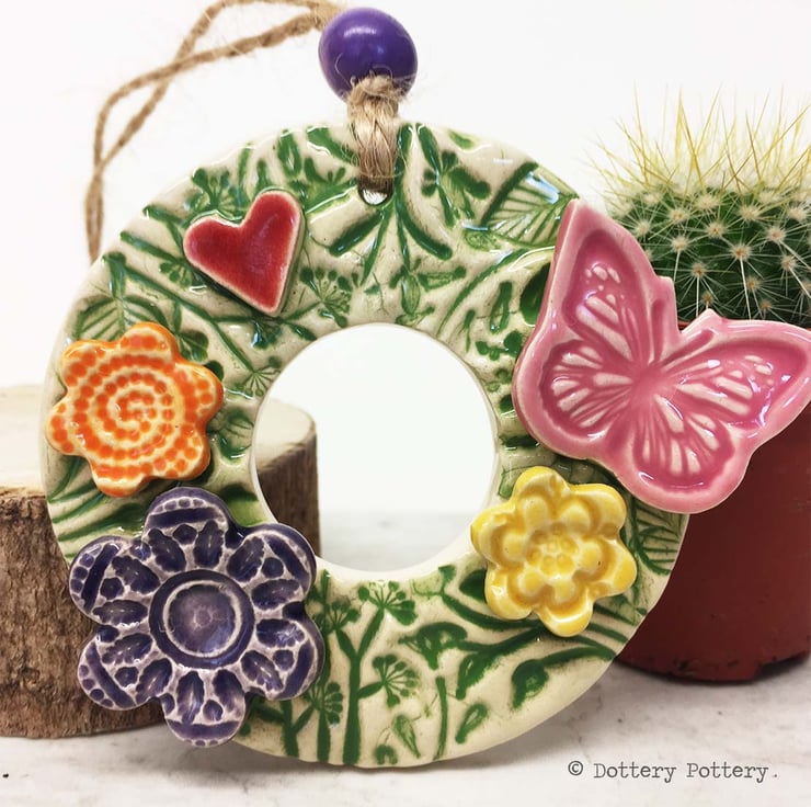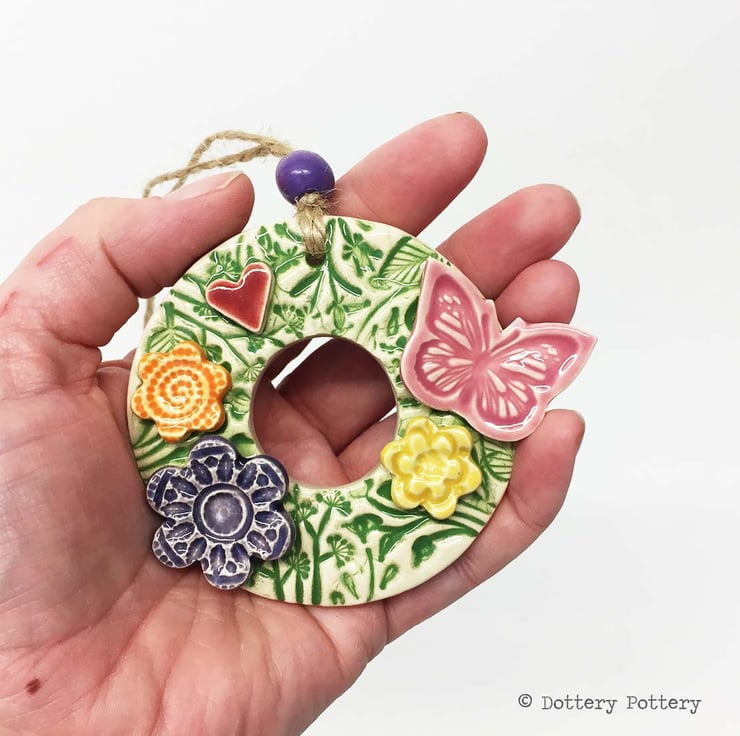 This butterfly themed hanging wreath decoration has been made from white earthenware clay and fired twice. It has a leafy background which is decorated with bright, glossy flowers and butterflies. The rustic style is complimented with a brown hanging string. It measures 7cm diameter and 1cm deep.