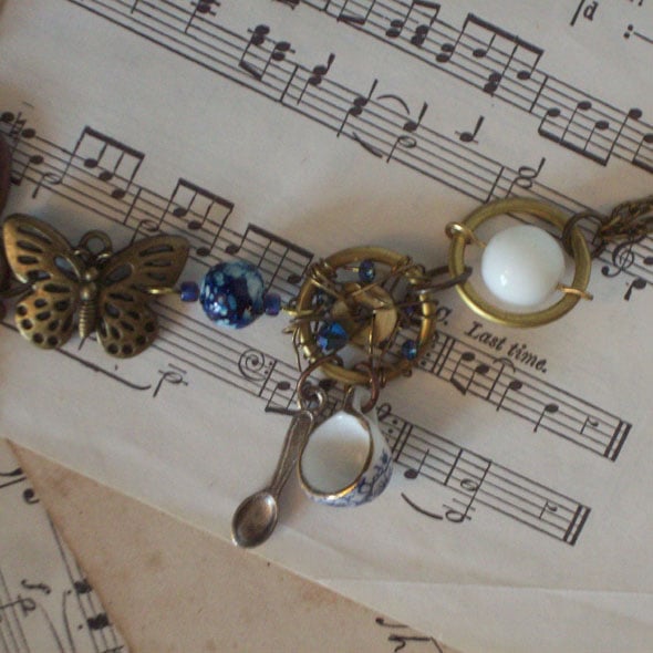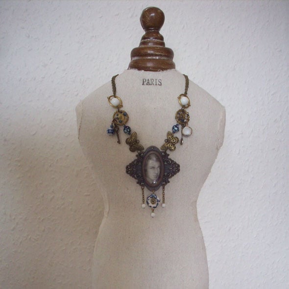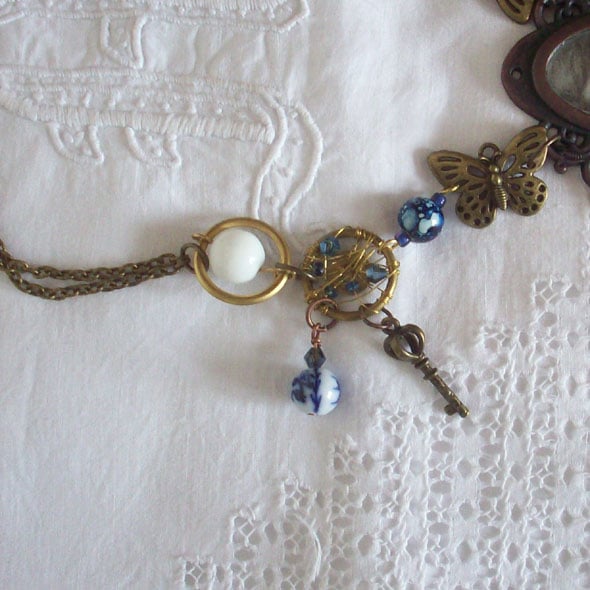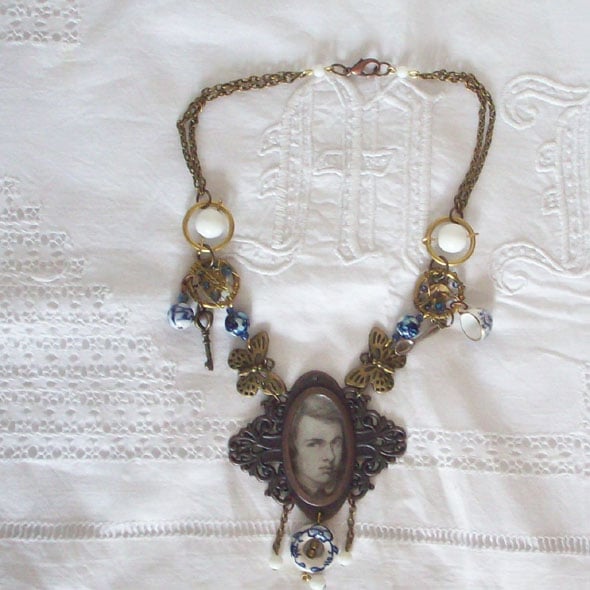 Here you have a statement piece made with love and care, imagination and attention to detail. This Victorian artist is nearly as famous for his chaotic love life as for his pictures and poetry. Sepia image under resin with the words "Art"& "Love"added. The central motif is in an antique coppery coloured ornate frame with drops. Two butterflies frame the motif symbolising the butteflies in women's hair in his work and the fleeting nature of life. I've added in lots of beads in his favourite blue and white china, just then coming into vogue, which he used to buy in London and Paris, there's even a tiny cup and spoon!