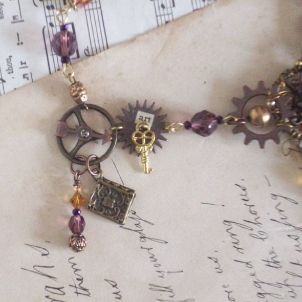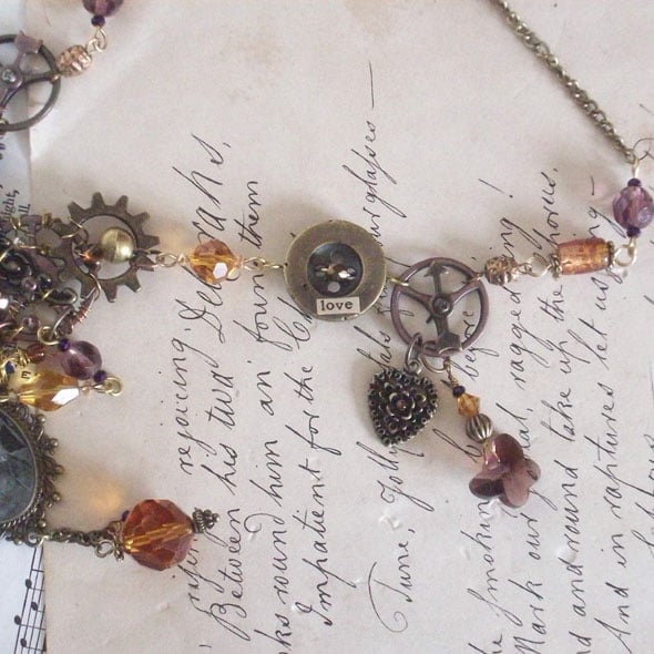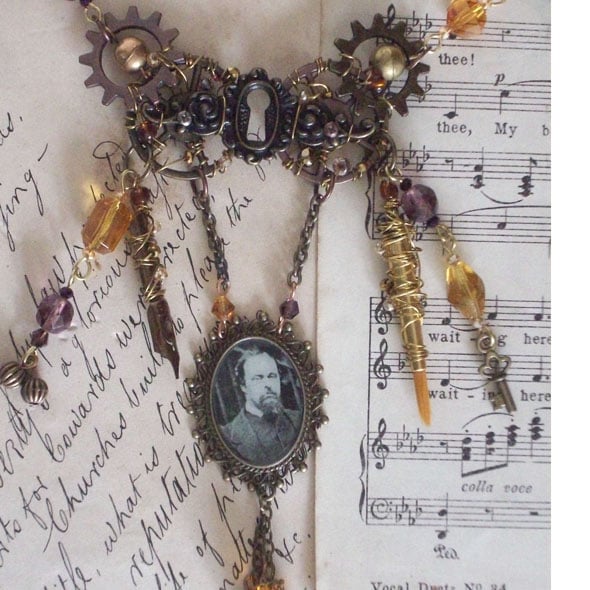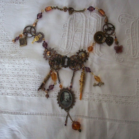 This is an absolutely fabuous statement piece, in tones of copper plum and amber. Whenever I wear my own version of this necklace it is admired every time. It is made for you with love and care, imagination, and attention to detail. A real designer piece. A sepia image of the artist protected under resin is the centrepiece of the design. The pendant hangs from a keyhole escutcheon wrapped with wire and beads and gears forming a butterfly shape. To celebrate his two professions of poet and painter there's a pen nib and a paintbrush. "Love" and "Art" are collaged onto other elements with spinners on gears symbolising his changeable love life. The plum and amber coloured faceted beads are vintage which is nice.