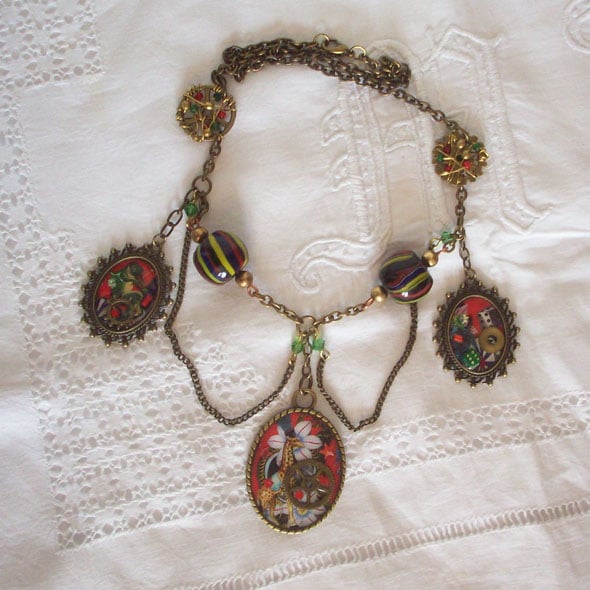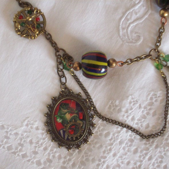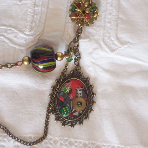 Triple drop necklace with carnival images, gears and charms set into resin. Two bold handblown glass beads pick up the colours ansd stripes in the frames. Wire wrapping on gears embellishes the chain.It's a fun piece, I'm not sure whether I like the fiddle playing frog best or the little dice I have had for years that just fitted in perfectly here!