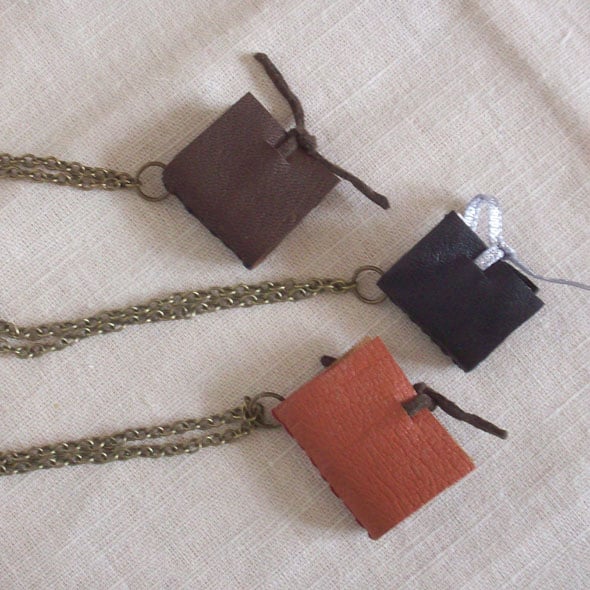 Necklace is 45 cm long and the books vary slightly, the brown one for example is 3 x 2.7 cm.