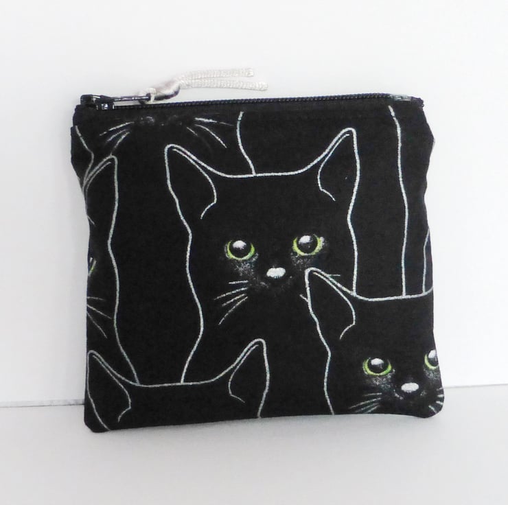 The main fabric is black with an all over print of black cats, outlined in metallic silver colour with green highlights for the eyes.