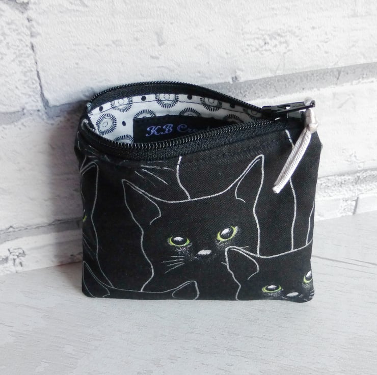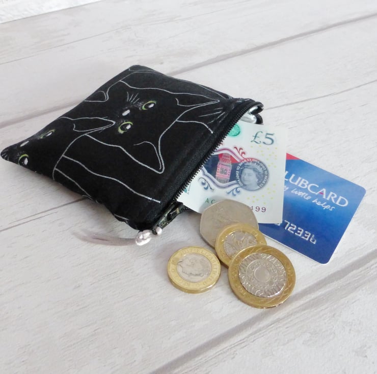 Opens at the top with a matching zip and is lined in a black on white patterned cotton fabric which is divided in to 2 sections, ideal to keep your notes or card separate from the coins.