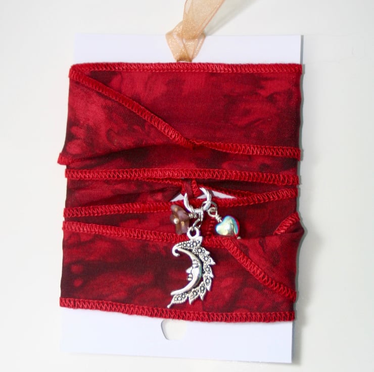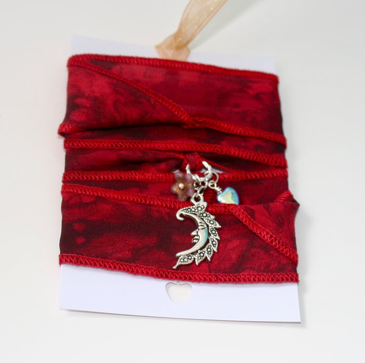 A gorgeously soft wrap bracelet made from red tie-dyed silk ribbon finished with a purple glass flower bead, a shimmering heart and a silver plated moon charm.