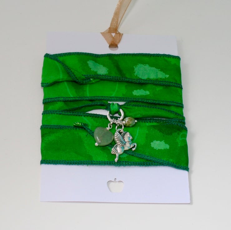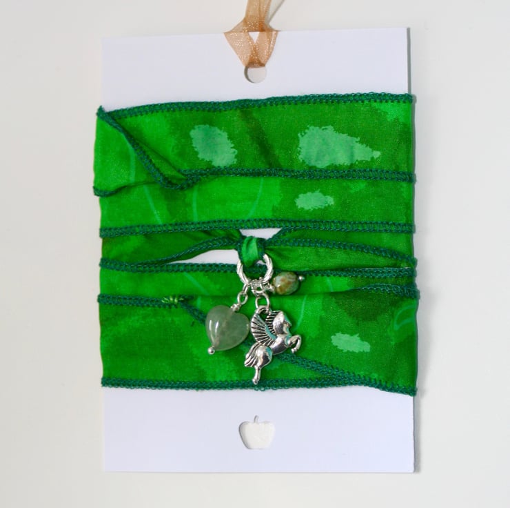 A striking and soft wrap bracelet made from green patterned silk ribbon finished with an aventurine heart, a faceted olive green flower bead and a silver plated Pegasus (winged horse) charm.