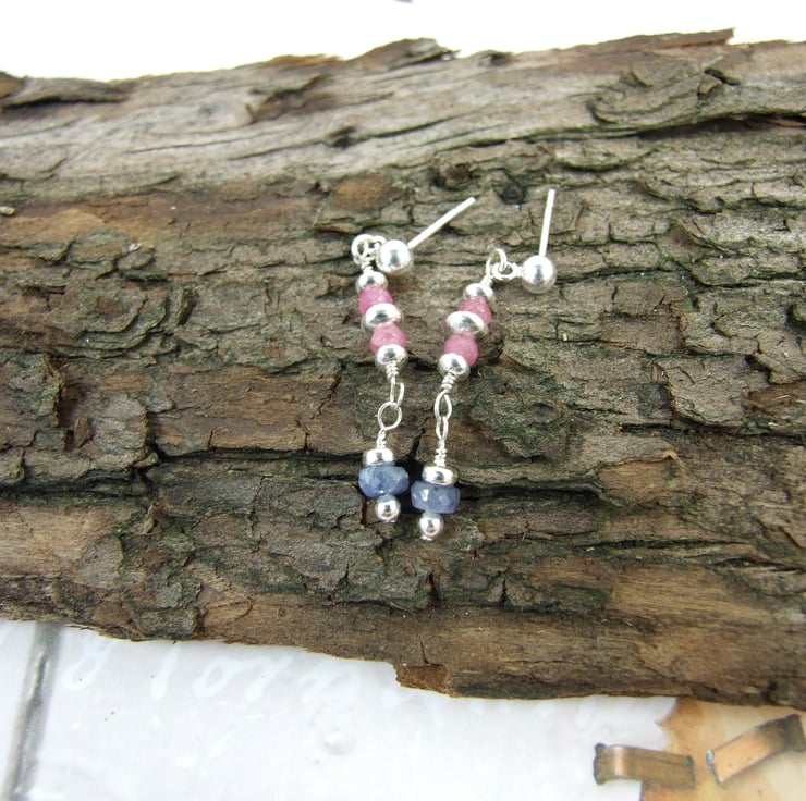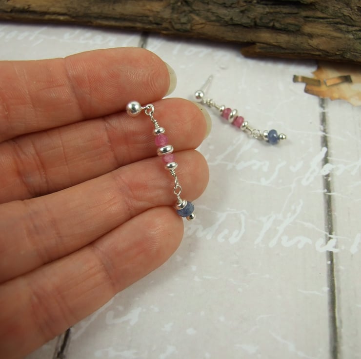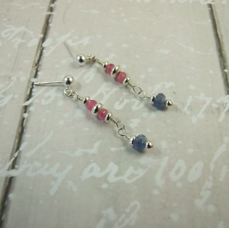 Delicate Blue and Pink Sapphire Earrings, Sterling Silver with stud fittings.