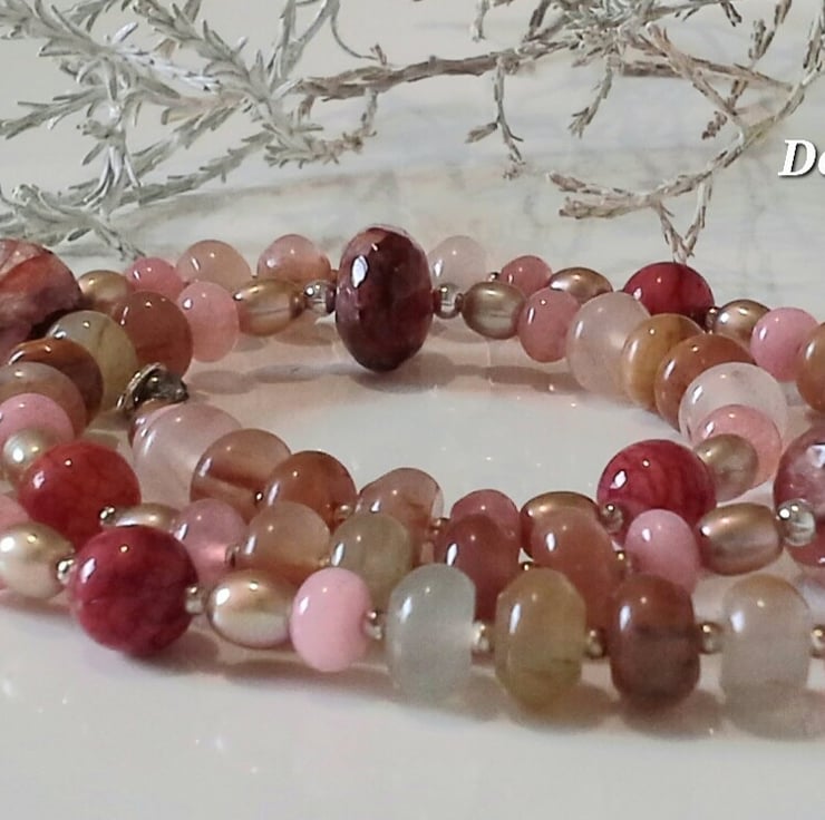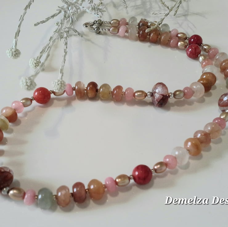A lovely luxurious looking necklace designed and created from a mix of quality quartz and quartzite gemstones, complimented with rice shaped genuine freshwater pearls and 925 sterling silver beads. For the main construction coated professional stainless steel jewellers wire has been used for added strength and lasting durability, finished off with a 925 sterling silver bolt ring clasp.