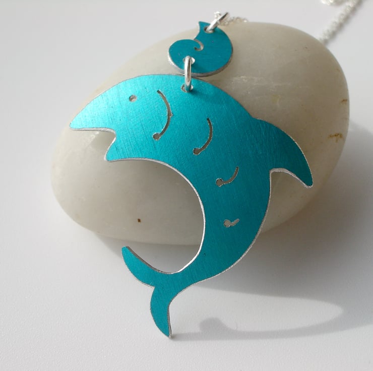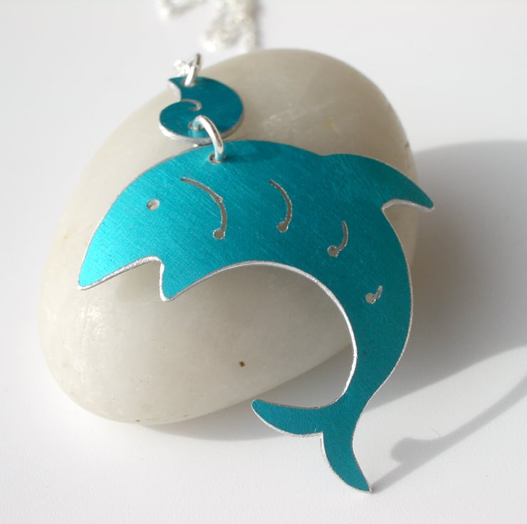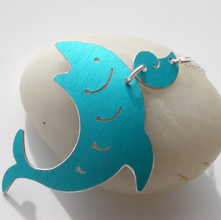 This fish pendant is made from anodised aluminium which I have hand dyed in turquoise. I cut out the fish shape by hand using a piercing saw and dome it slightly so that it catches the light. Finally I file and emery the edges to give a smooth finish. The fish measures approximately 35mm x 12mm and the small shell measures 9mm x 7mm. The sterling silver chain is 16" long, if you would like a longer length chain please ask.