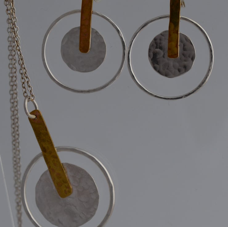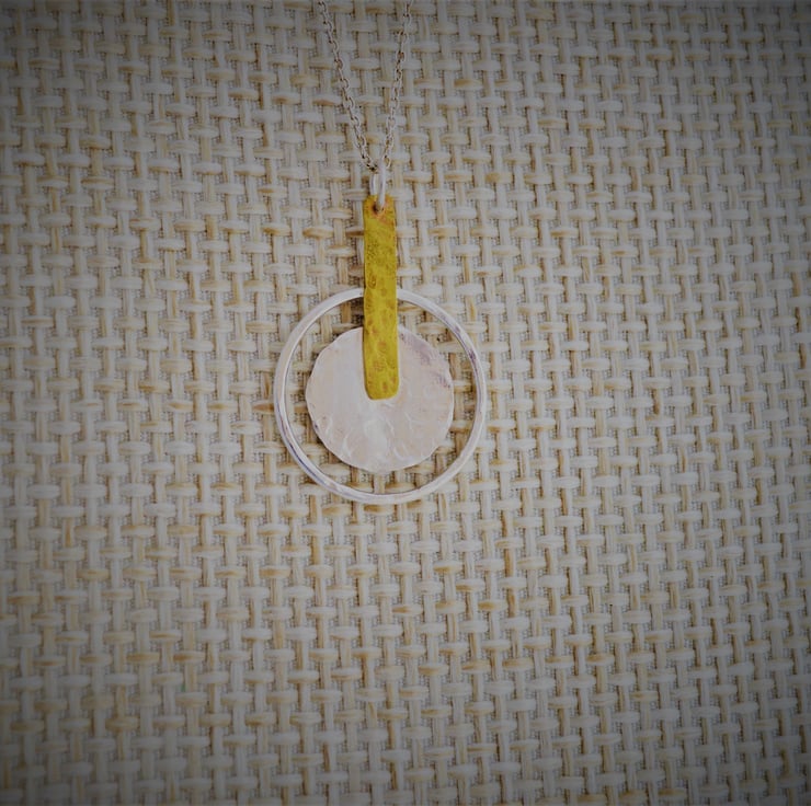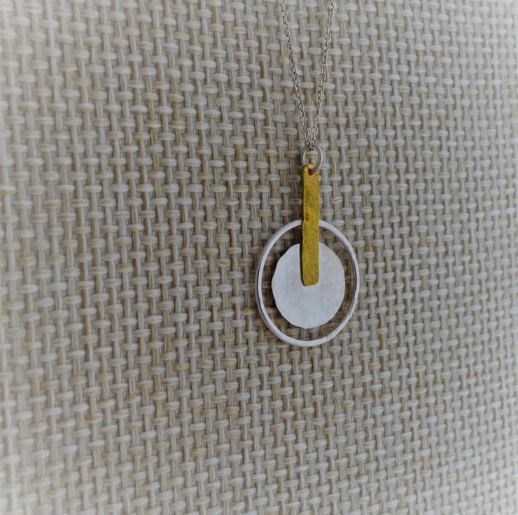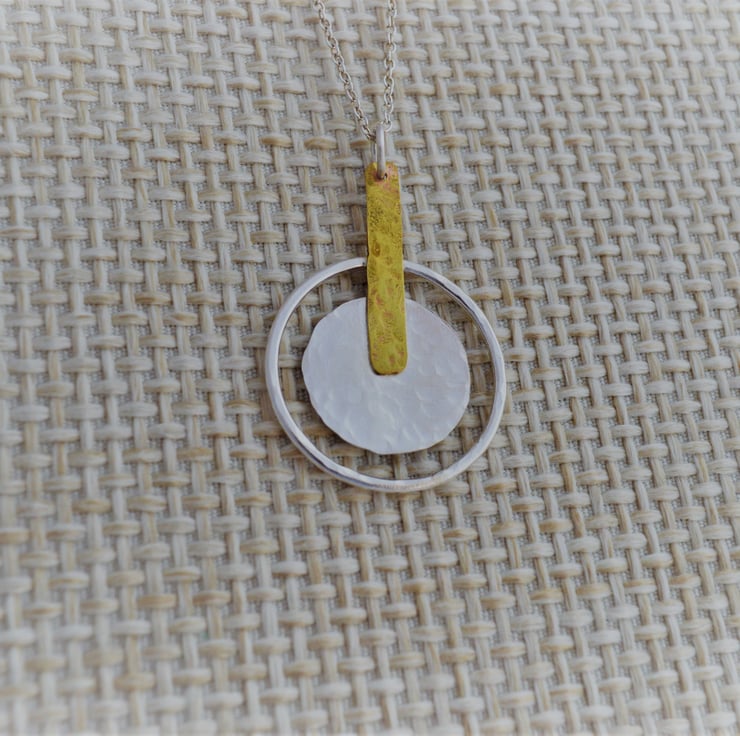 This sterling silver and brass pendant makes the ideal gift for a birthday, anniversary or just because.... Geometric design creating a minimalist yet stunning pendant. The central disc is 20 mm diameter has been cut from sheet silver that I hammered to create a light texture. The outer ring is made from 1.2 mm round sterling silver wire this has also been textured. To contrast the silver I used a small piece of textured brass 28 mm x 5 mm to join the pieces together and then attached a jump ring through which I have added a 45 cm ( 18 inch) sterling silver chain .