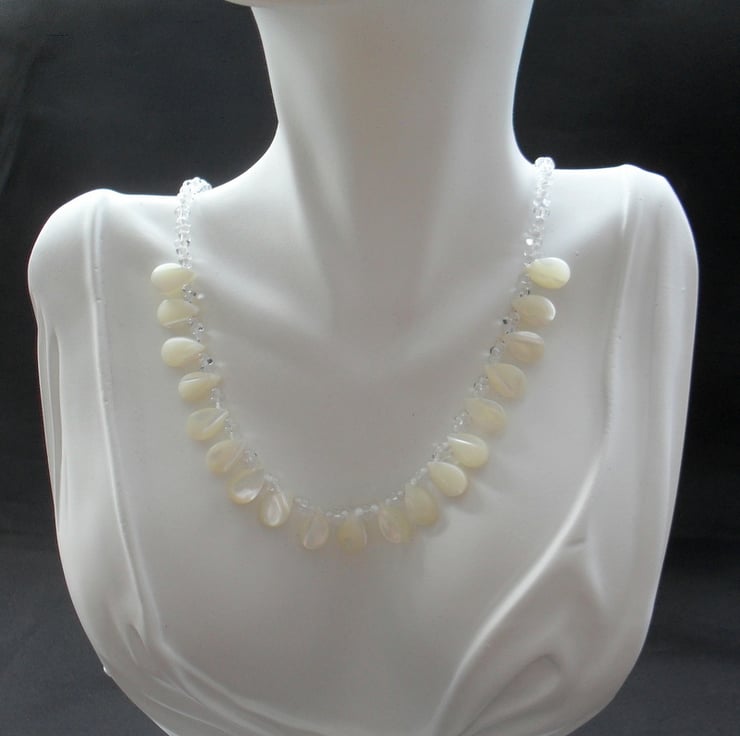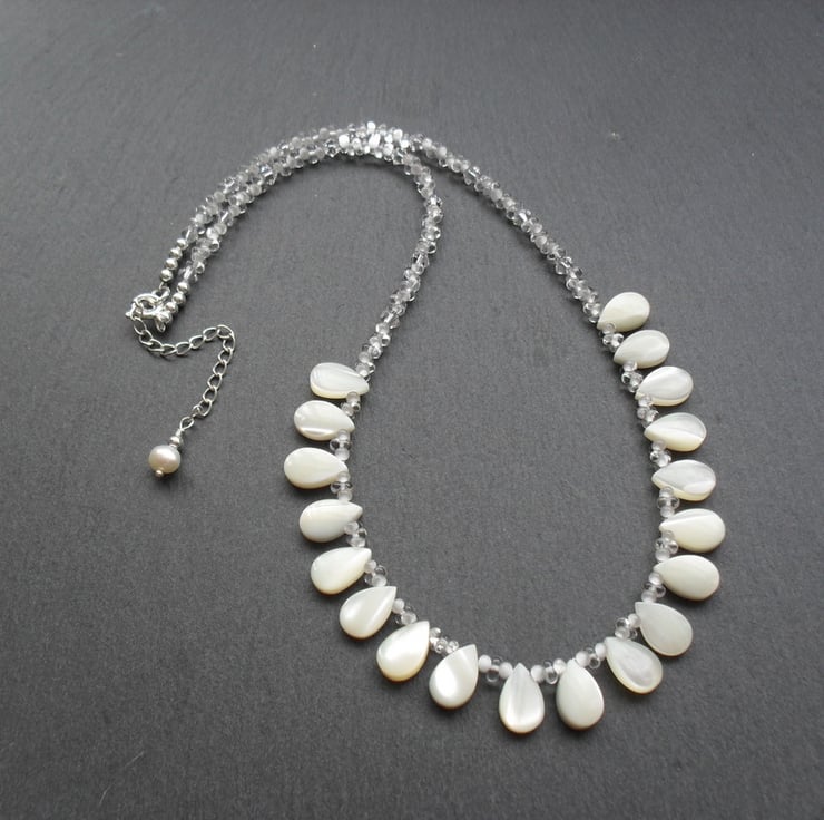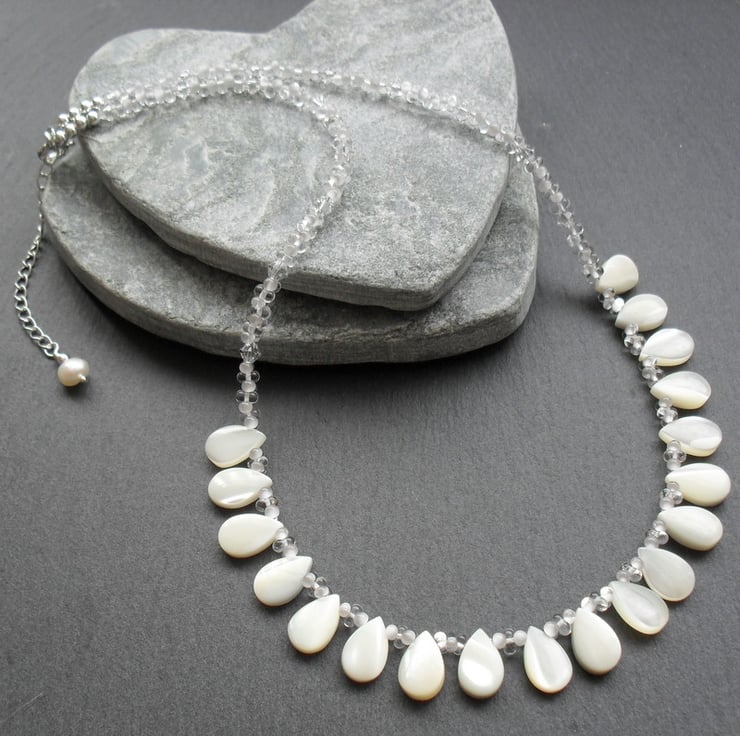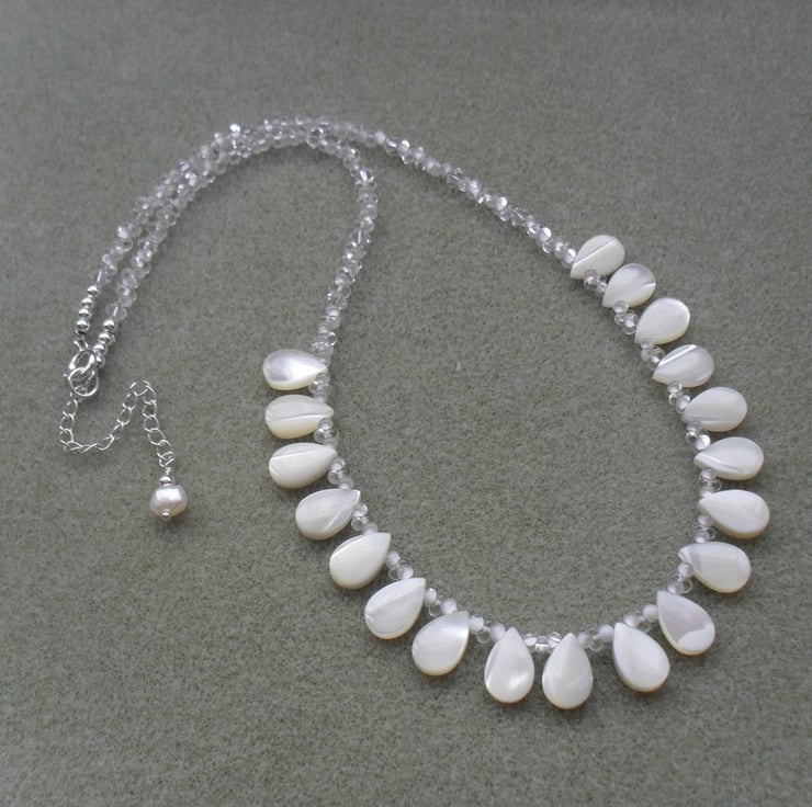 Mother of Pearl Drops, swarovski® crystals and small glass beads which are clear and white are beaded onto beading wire and attached to a sterling silver bolt ring clasp with a extender chain