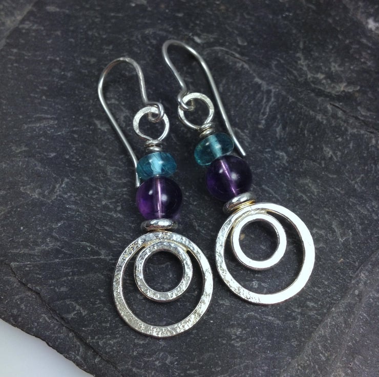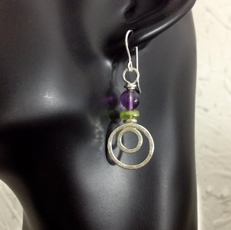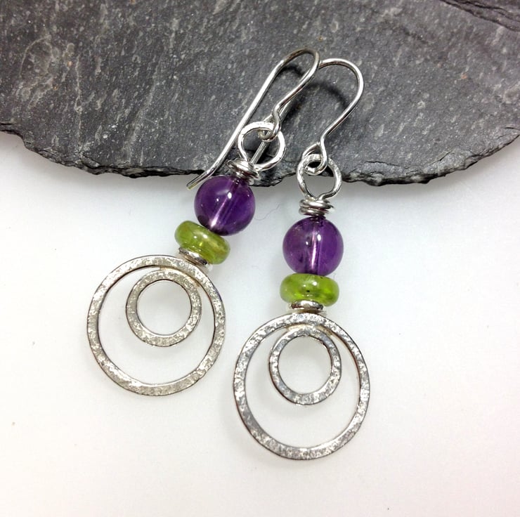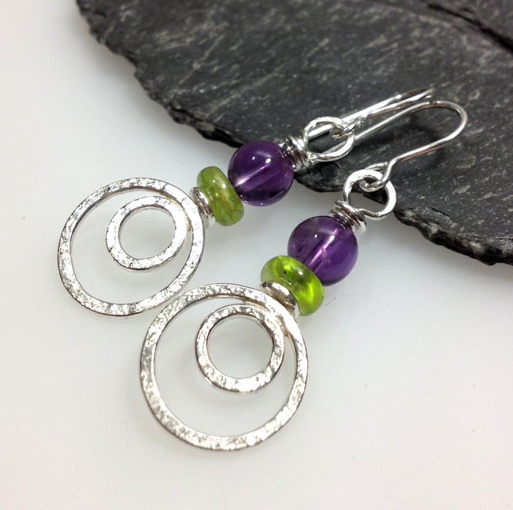 Sterling silver earrings with amethyst and peridot gemstones.
