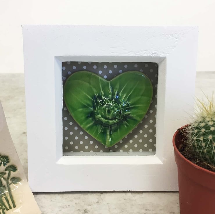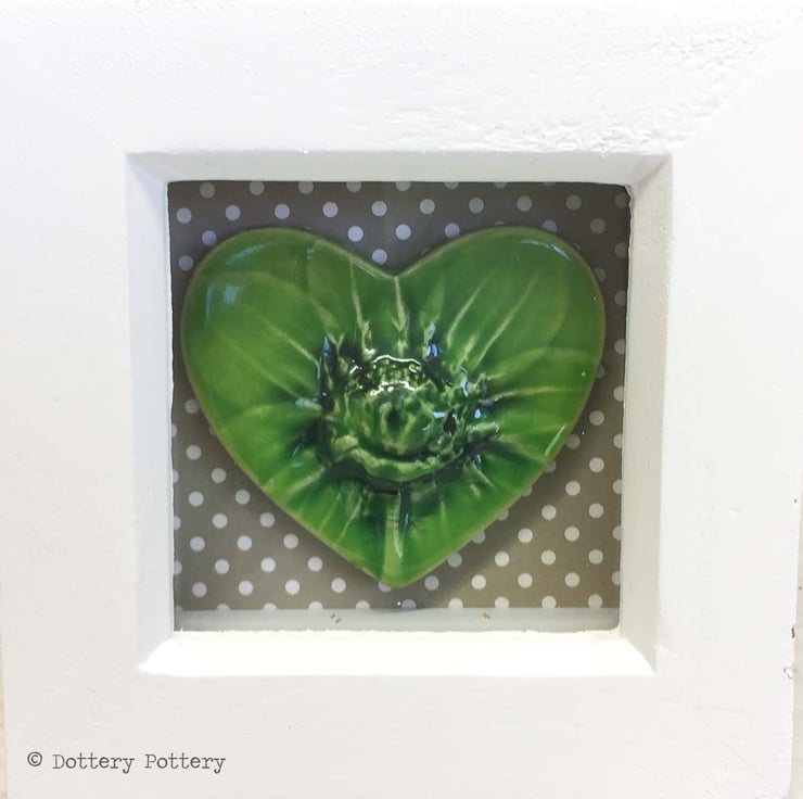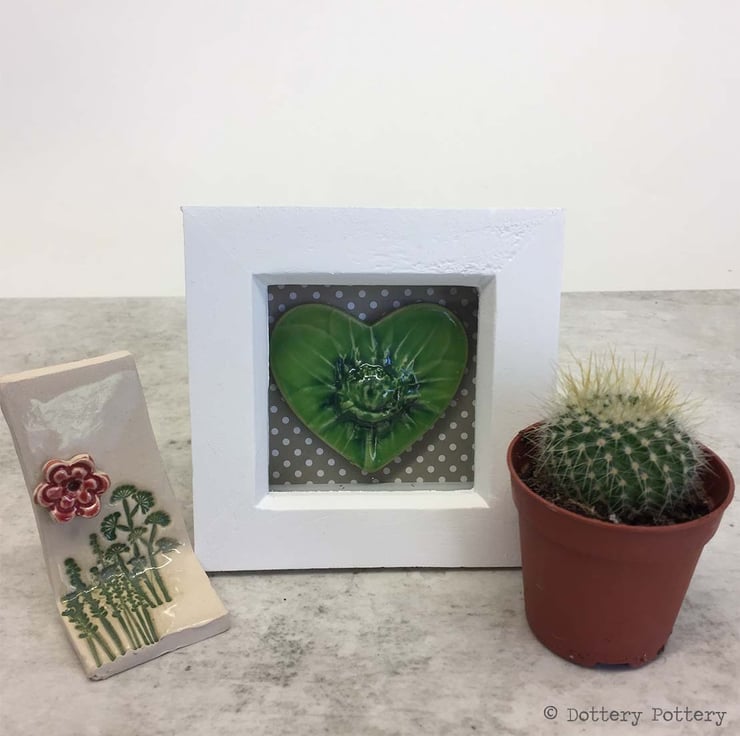 This little ceramic heart tile has been made from white earthenware clay and decorated with a subtle floral scene.It has then been fired, glazed and fired again in the pottery kiln. It has been mounted in a small white box frame with a glass front which measures 10.5cm x 10.5cm x 3.5cm deep.