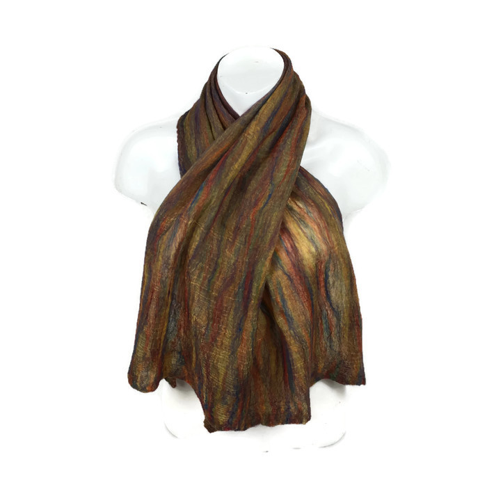 This scarf has been made using a rainbow blend of merino wool fibres on a yellow silk chiffon base. It is felted on both sides. The scarf measures approximately 120cm x 36cm (47.25" x 14.25") and will arrive wrapped in pretty floral tissue paper making it an ideal gift. Information about the nuno felting process and full washing instructions will be included.