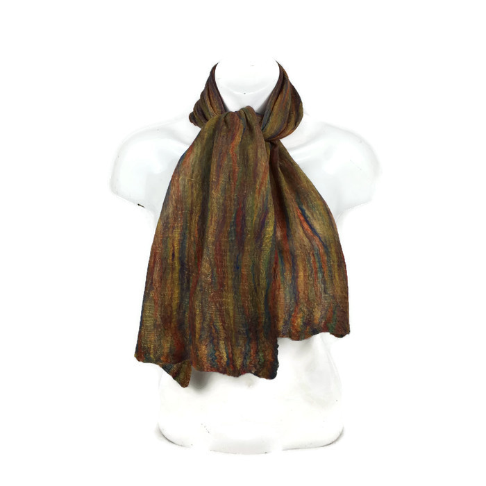 A beautifully soft and lightweight merino wool scarf. A very fine layer of merino wool fibres have been nuno felted to a base layer of silk chiffon, a process that results in the woollen fibres migrating through and binding with the silk. The resulting scarf is amazingly fine and drapes beautifully around the neck and shoulders. Being made from all natural fibres it will be warm and snuggly in winter and yet cool enough for a summer evening.