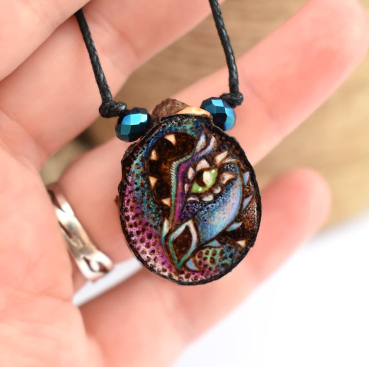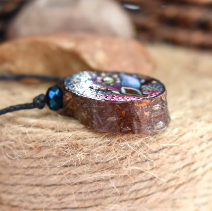My inspiration for this rustic tree slice pendant is a friendly rainbow dragon. If you’d like anything specially created, please get in touch!