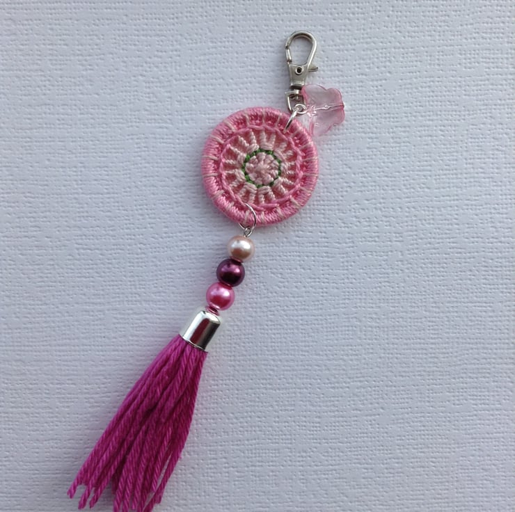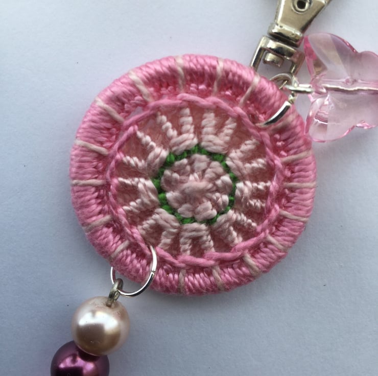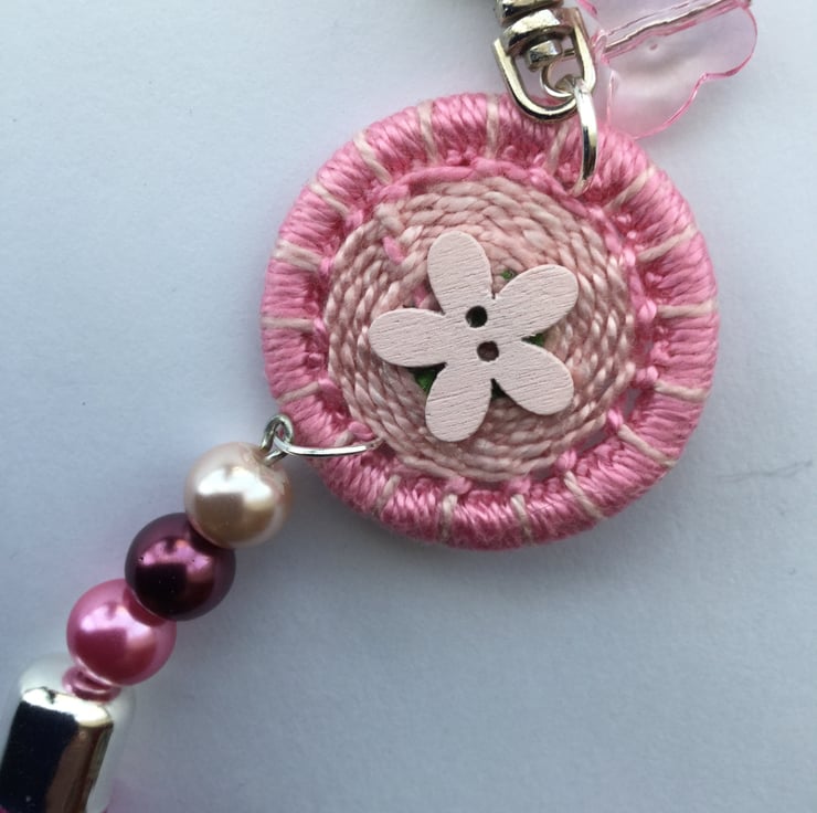 It has been fastened together with a pretty pink acrylic butterfly to a lobster claw swivel catch to attach it to your bag or zip.