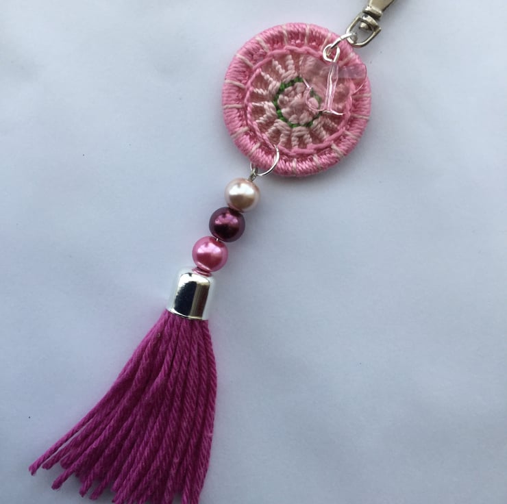 I have also made the tassel using a soft cotton thread in cerise pink with a white metal end cap and 3 glass pearl beads it has been added to the bottom of the Dorset button.
