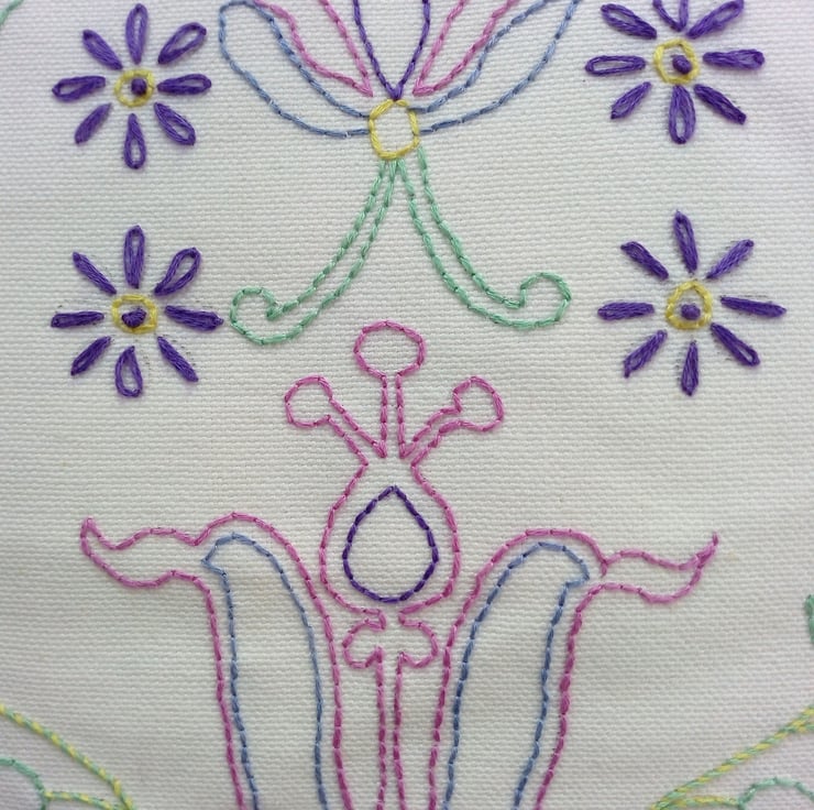 This pretty, one-of-a-kind, cushion cover features an abstract floral design that has been carefully hand-stitched with a mix of brightly coloured embroidery threads onto a heavy cotton fabric.