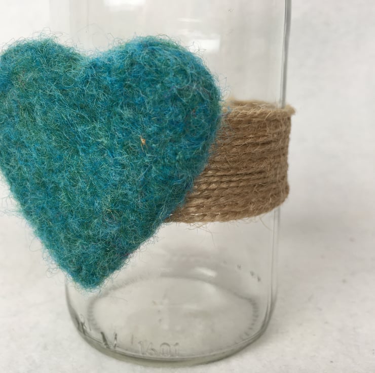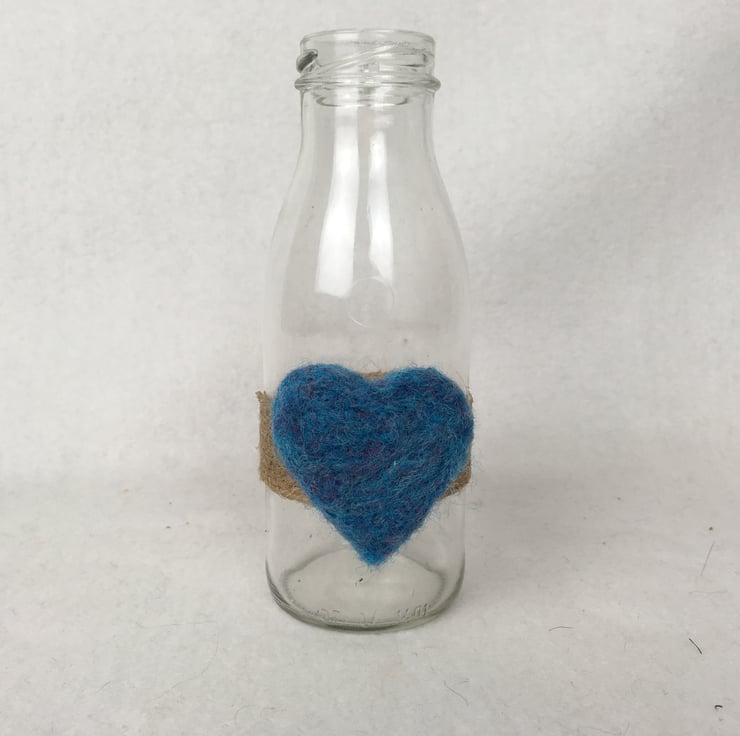A simple bottle vase wrapped in jute twine and embellished with a needle felted heart. This bottle vase measures 15cm (6") tall and 6cm (2.25") diameter, perfect for displaying all those gorgeous summer flowers or just decorative on its own.