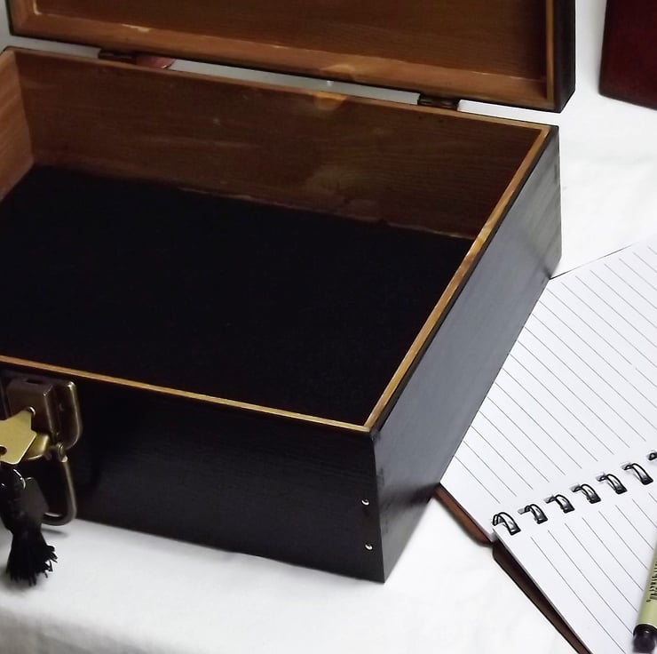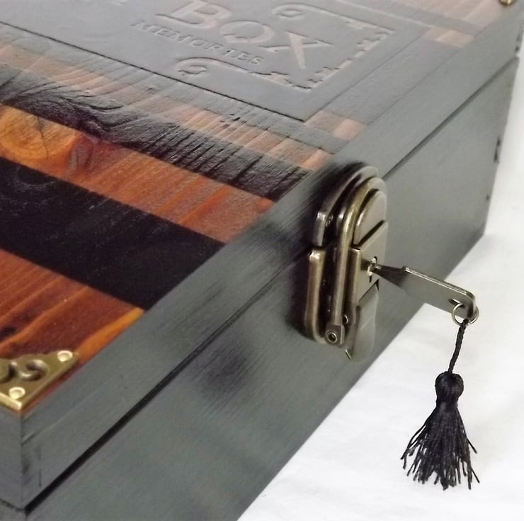 This is a large rustic wooden lockable Memory Box is a gloss Black with Oak stain and brass embellishments,