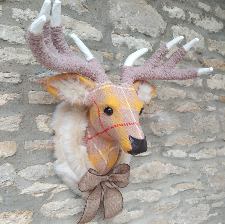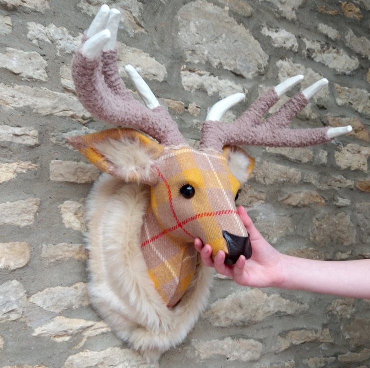 Handmade in genuine mustard check Harris tweed wall mounted stag deer.