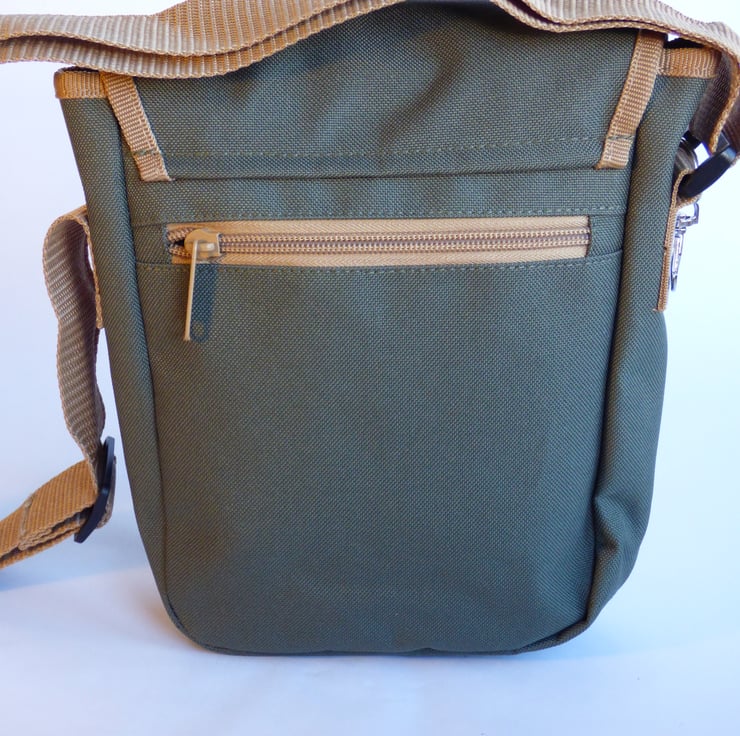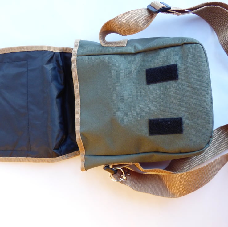 To the front is a velcro fastening and to the rear is a zipped pocket.