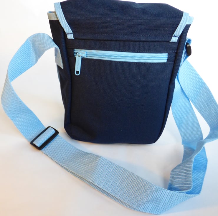 To the front is a velcro fastening and to the rear is a zipped pocket.