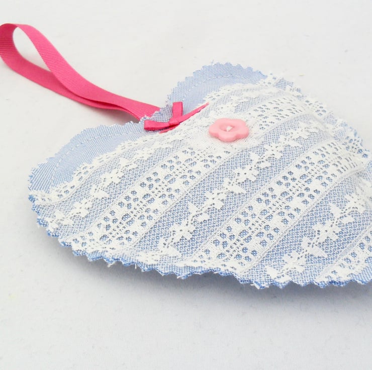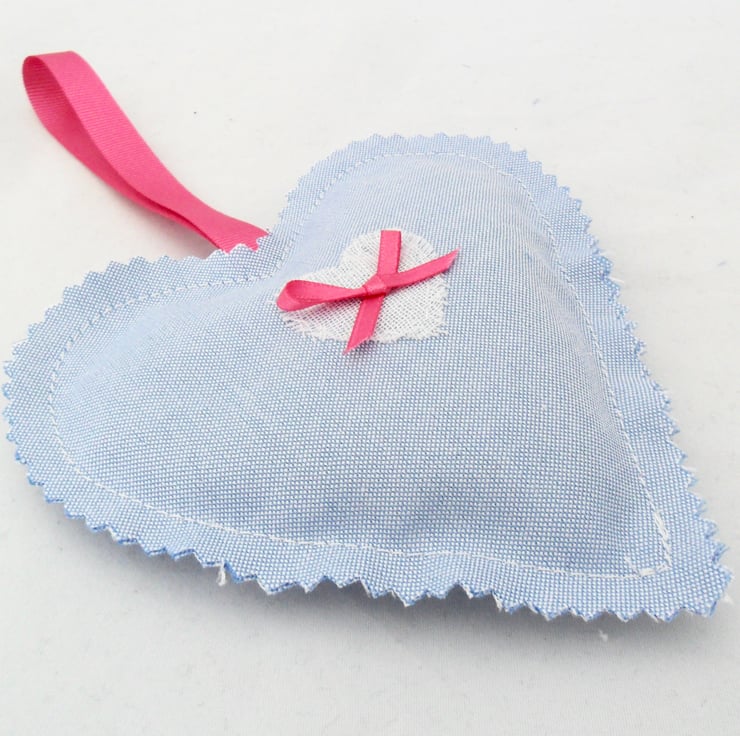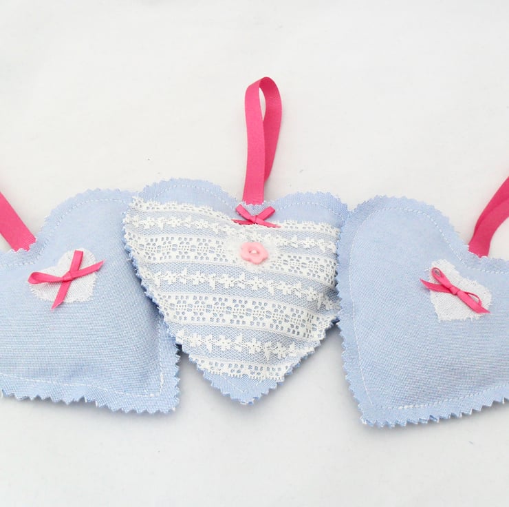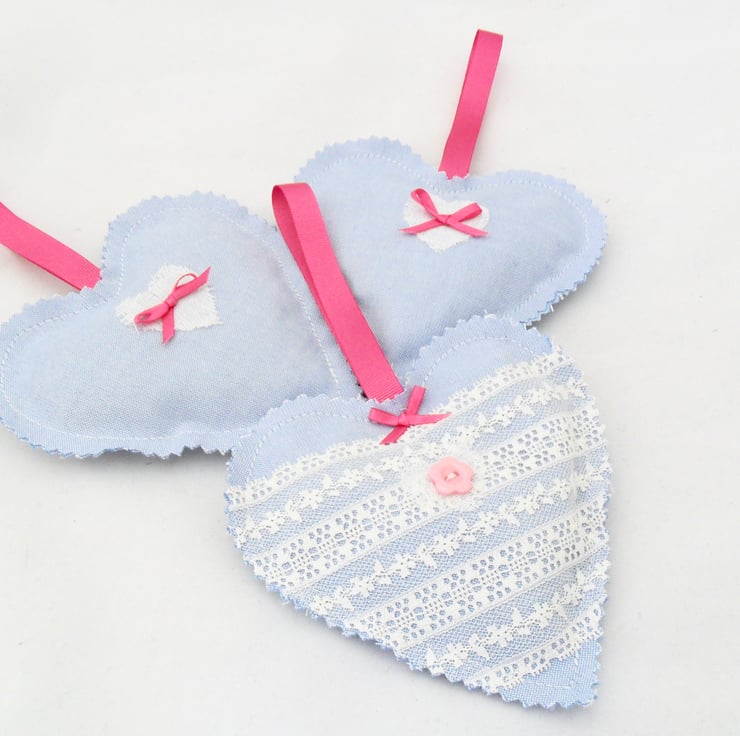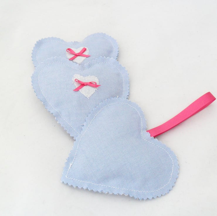 This trio of lavender scented hearts have been handmade using a pale blue cotton, and are generously filled with dried lavender from Provence. The lavender will scent your clothes with a wonderful fragrance which can be refreshed by gently squeezing the hearts. Two hearts have a cerise ribbon bow, but one has a wide white lace overlay and a small pink button. The lavender hearts have a pinked edge and have cerise ribbon loops.
