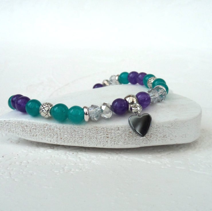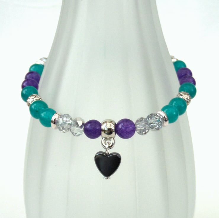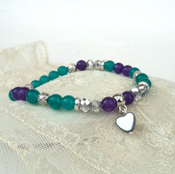A stunning combination of turquoise green / blue jade and quartz beads have been threaded with silver coloured crystals and silver coloured beads on stretchy jewellery elastic to make this unique bracelet.