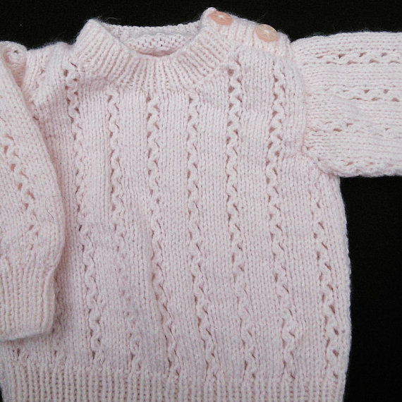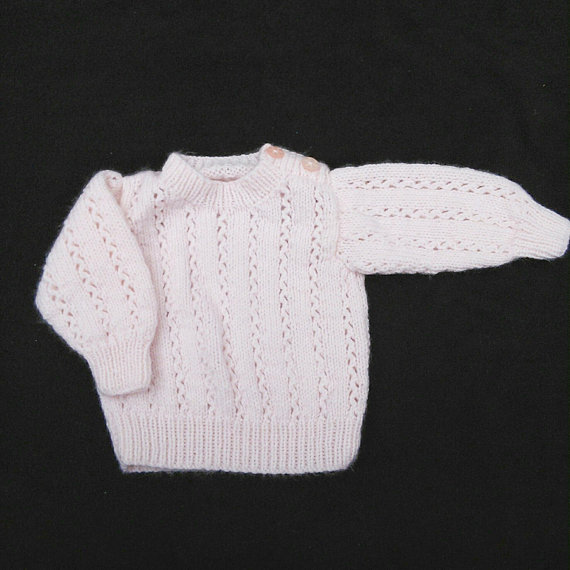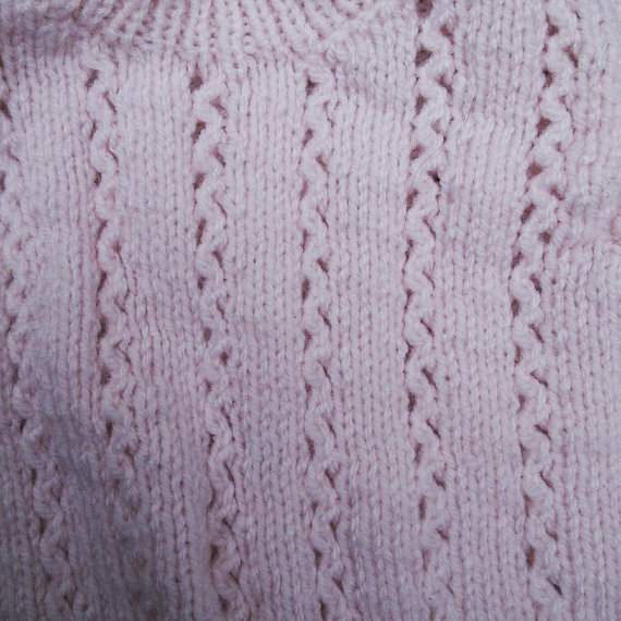 This jumper has been hand knitted using a pale pink coloured yarn. This round neck jumper is knitted in a simple stocking stitch with wavy vertical eyelet rows. The jumper fastens on the left shoulder with pale pink teddy shaped buttons.
