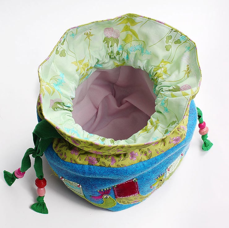 The drawstring part of the bag is made from two of my prints and is pulled up with green cotton tape trimmed with pink beads.