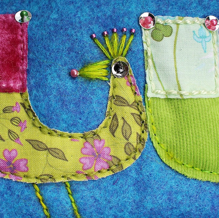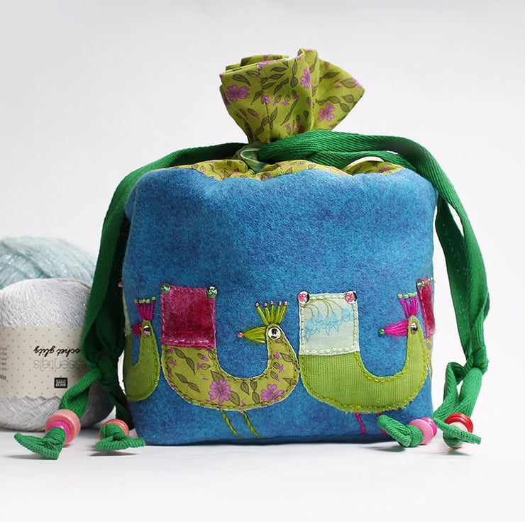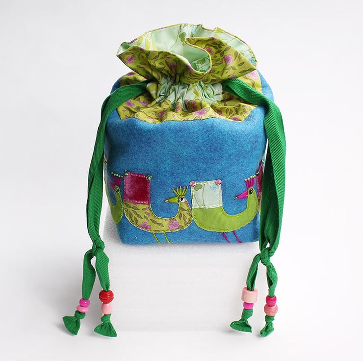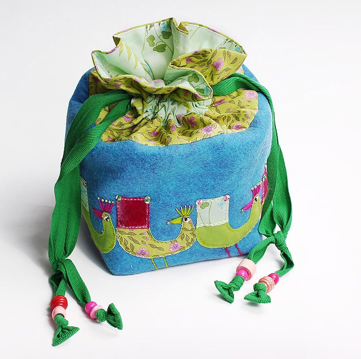 The main part of the bag, which is cube-shaped, has been made in turquoise wool felt and this cube is 6"(18cm) square. I have hand appliquéd eight peacocks all around the bag in two different colour ways.