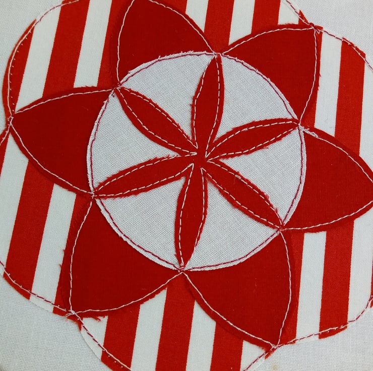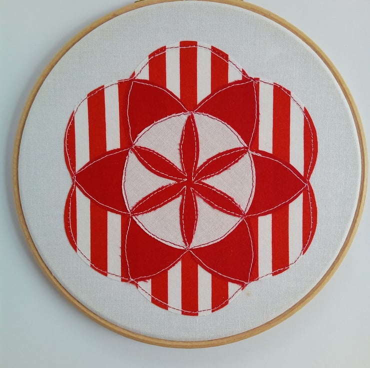Each element of this vibrant 'seed of life' design has been carefully hand cut from red and white fabric then free motion, machine stitch embroidered.