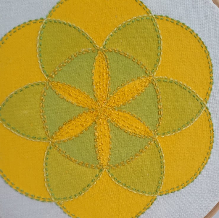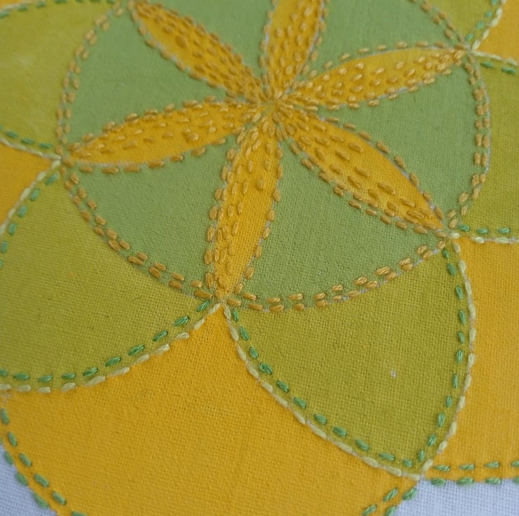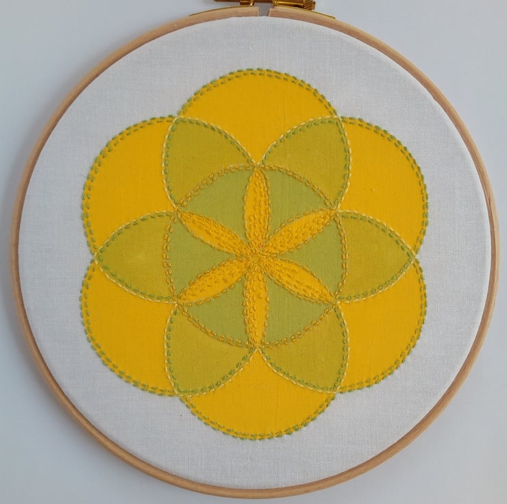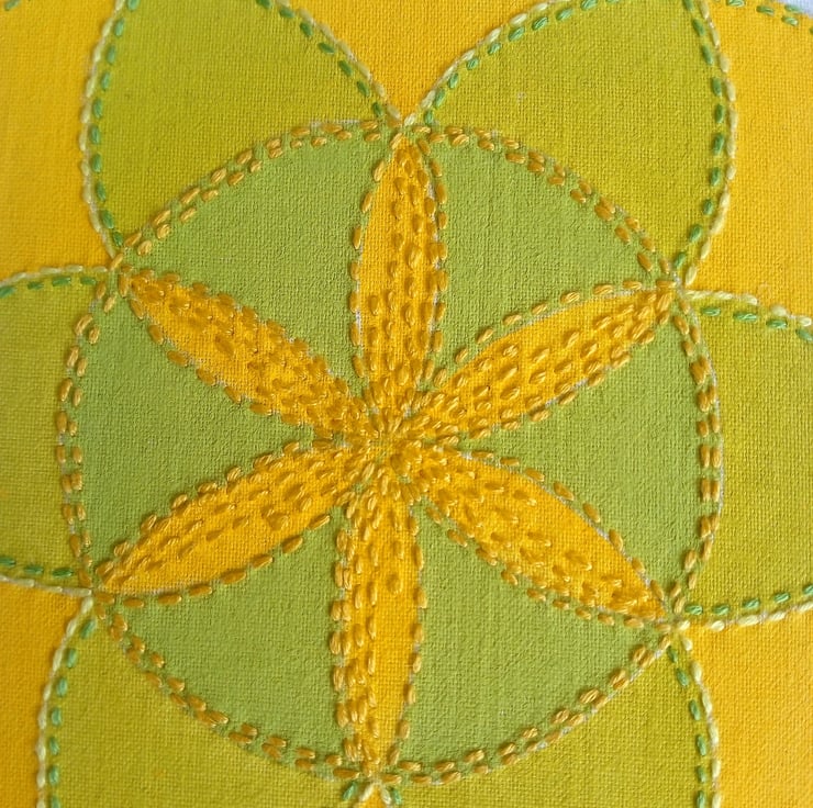 This 'seed of life' geometric design was firstly painted with acrylic paints in hues of yellow/green; then hand stitched embroidery was used to add interest and texture.