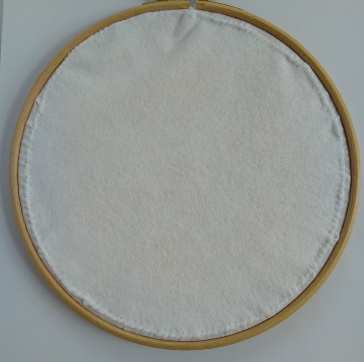 A 7" wooden embroidery hoop frames the design and white felt has been used to give a neat finish to the reverse.