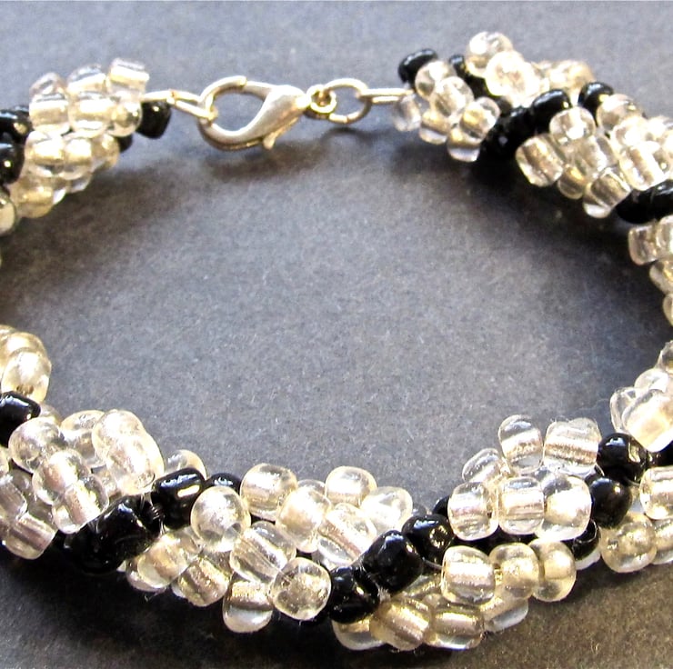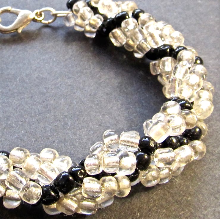 Large and chunky black glass seed beads are twisted and woven around clear, silver lined seed beads.