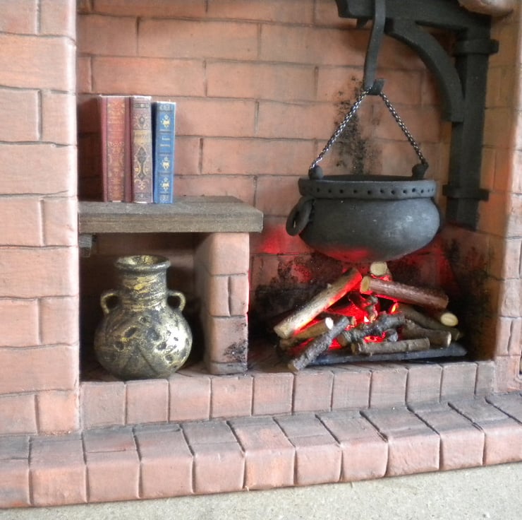 Made from terracotta air drying clay and wood this is a lovely handmade fireplace / cooking surround that would enhance any miniature setting.It has a fully lit fire and a opening cupboard door for storage. It also has a log store and a small counter top for food preparation.