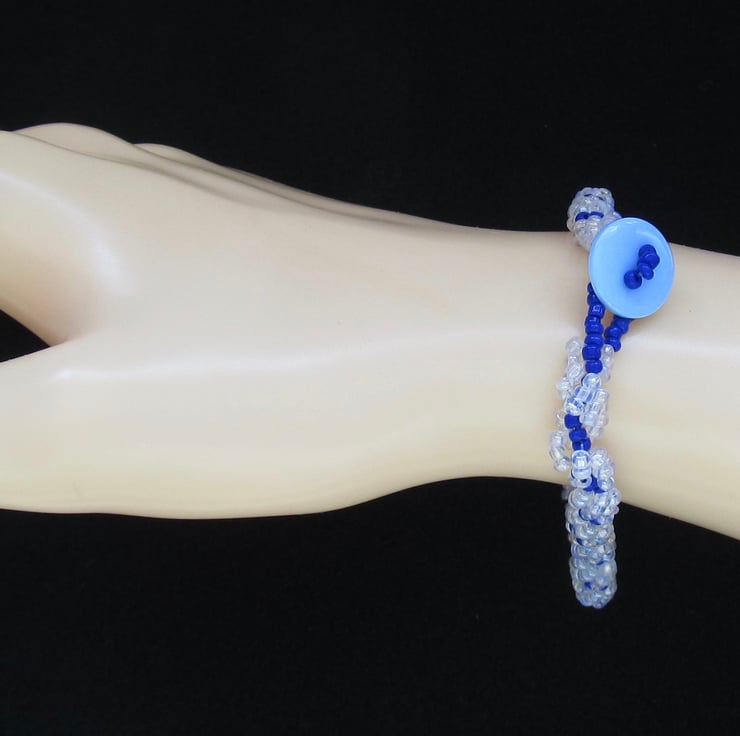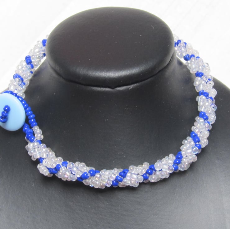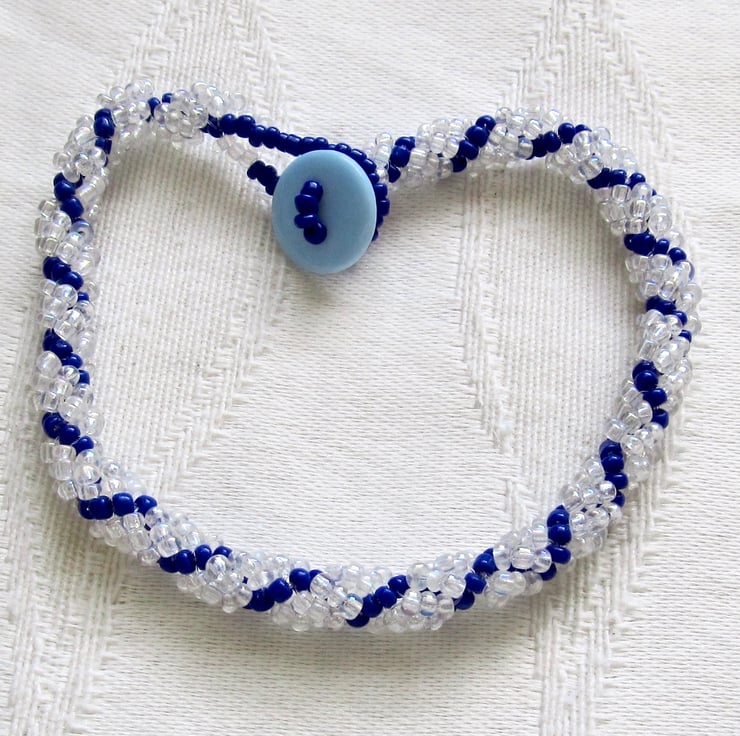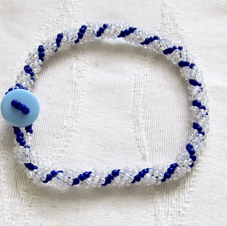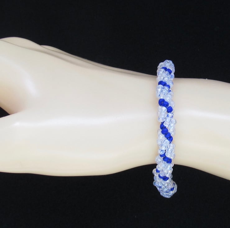 Using the spiral weave, I have woven small cobalt blue glass seed beads with small silver lined clear glass seed beads to give a very distinctive piece of jewellery.