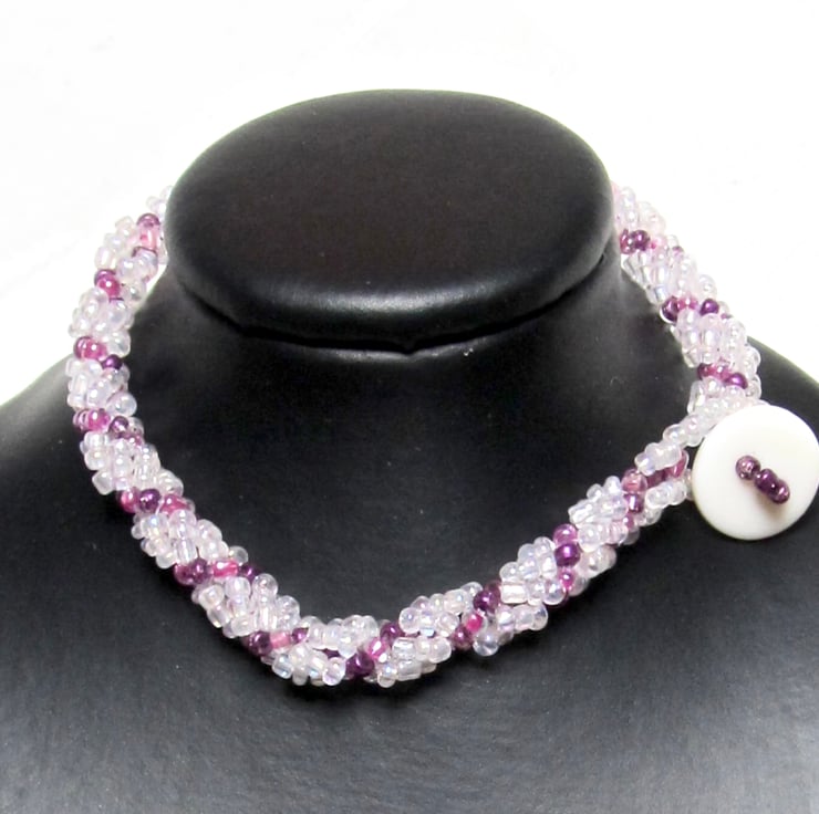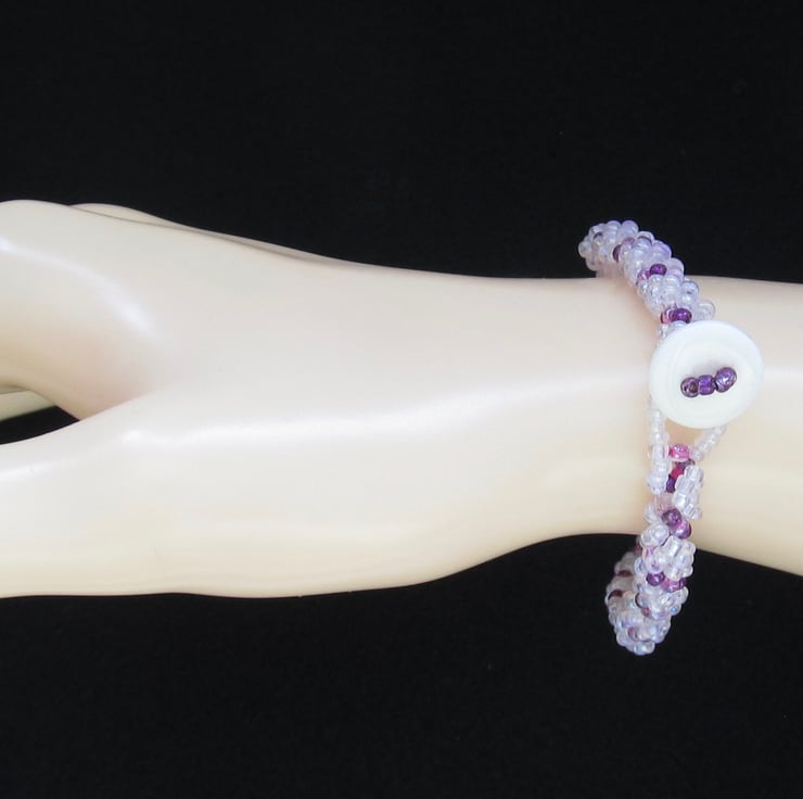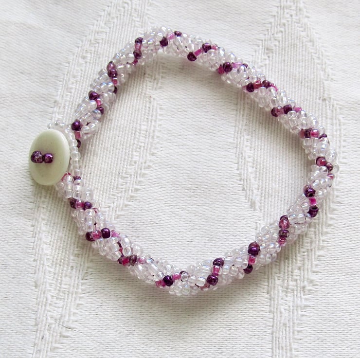I made this bracelet using the spiral weave, with lovely tiny assorted purple glass seed beads and beautiful, tiny silver lined clear glass seed beads.