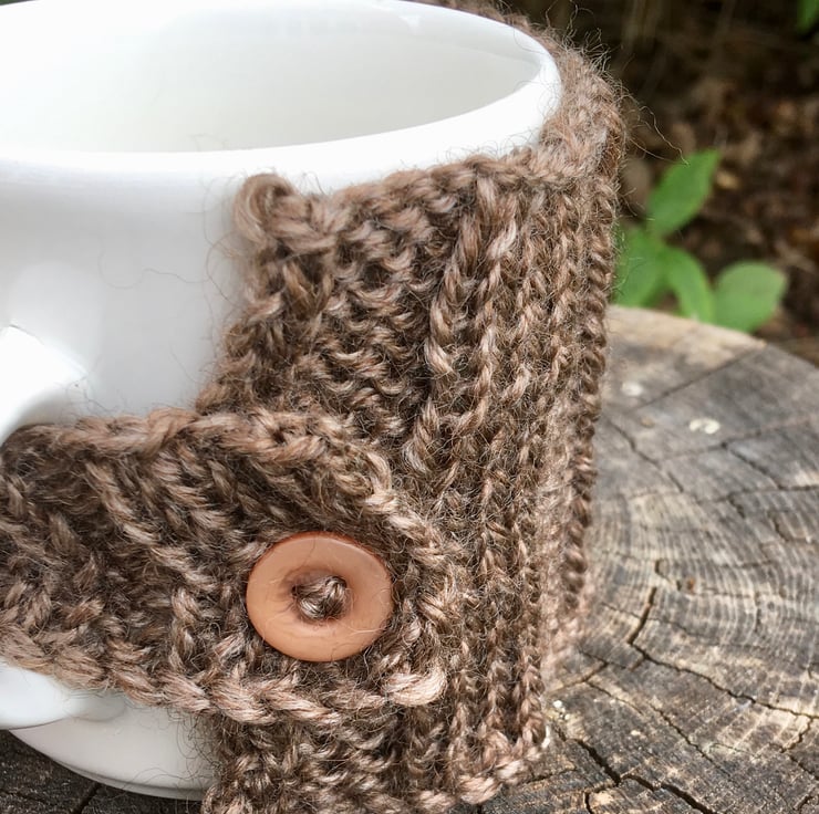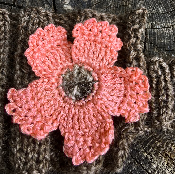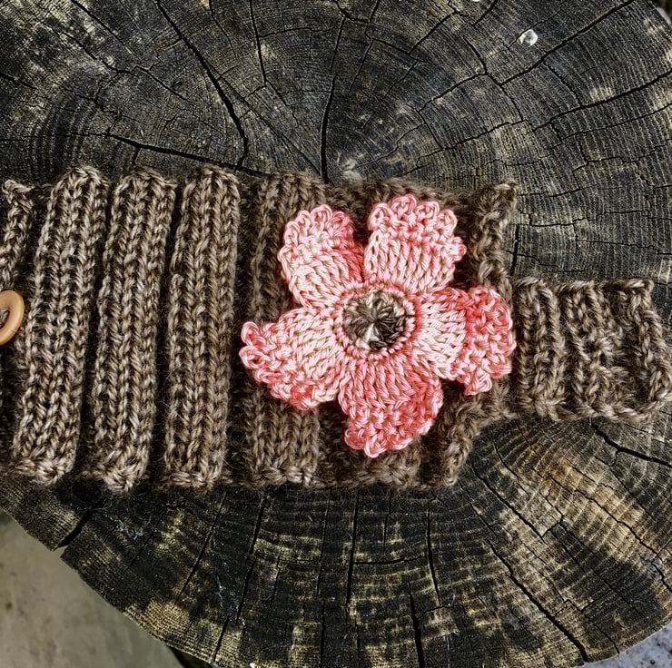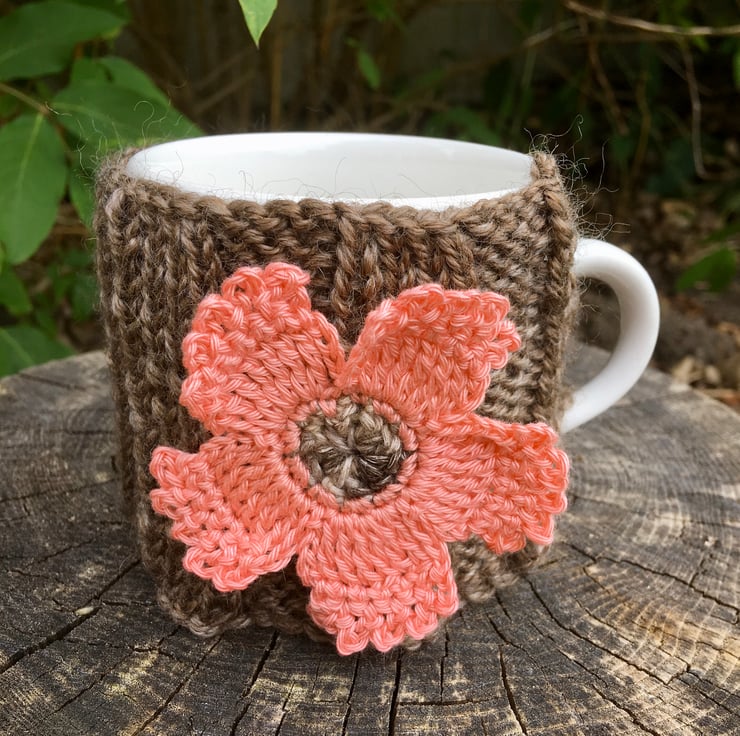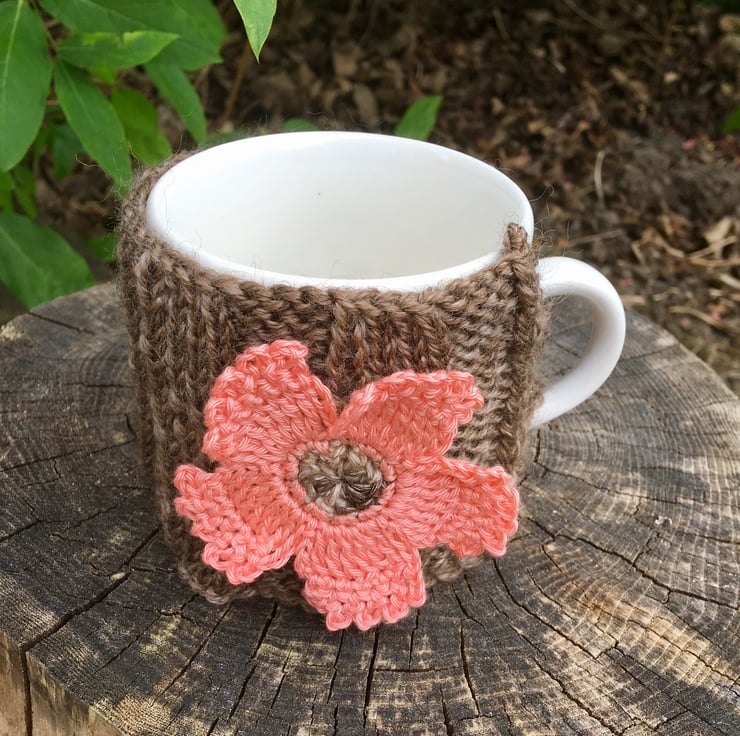 A pretty coral flower sits on this brown ribbed mug cosy. The coral flower is crocheted using 100% cotton and has a brown centre. I have hand knitted the brown mug cosy using a wool mix yarn and there is a button sewn on for easy fastening.