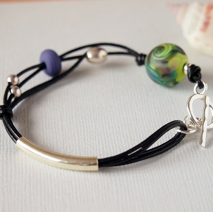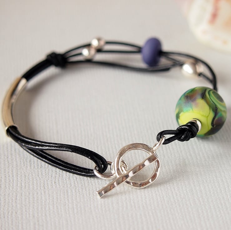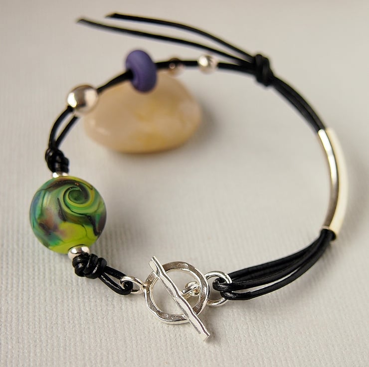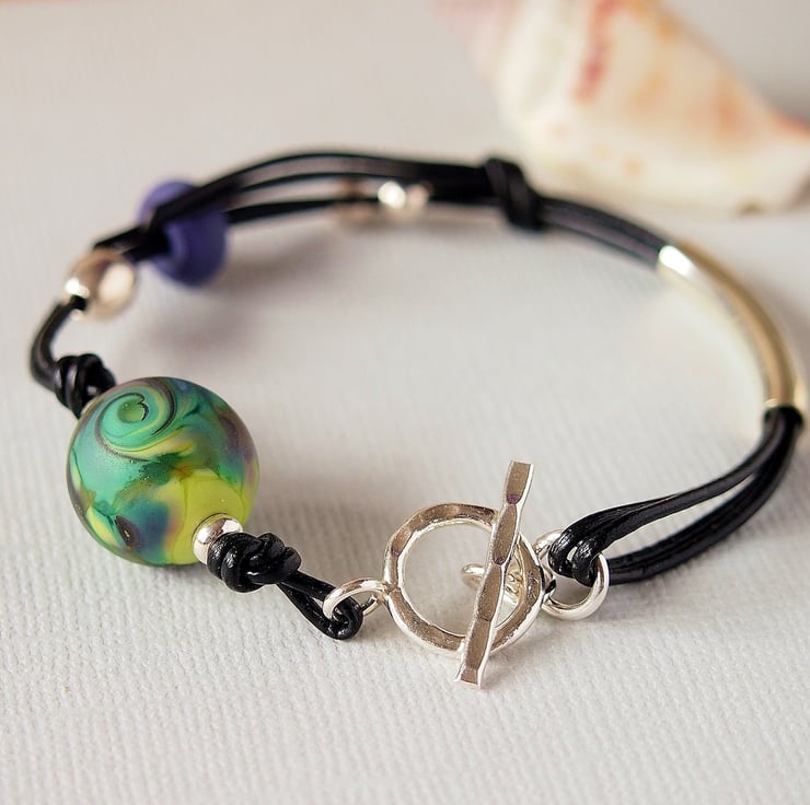 Handmade bracelet featuring a lovely handmade lampwork glass bead threaded on 1mm leather thong.