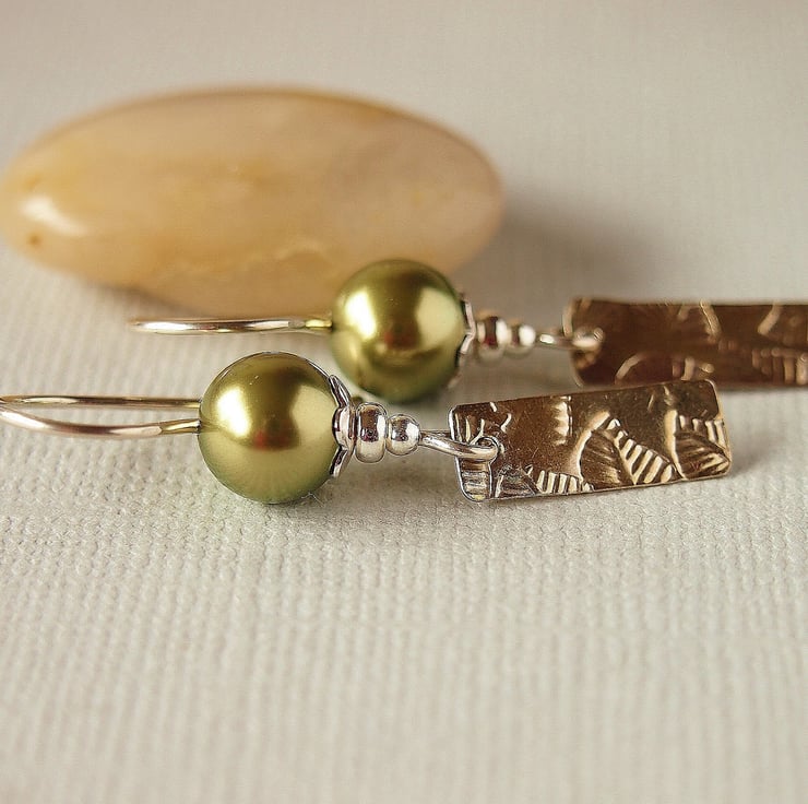 These gorgeous earrings have been forged from 20g silver wire on which I have threaded sterling silver beads and a Swarovski crystal glass pearl. Pretty sterling silver handmade leaf print drops swing gently at the bottom