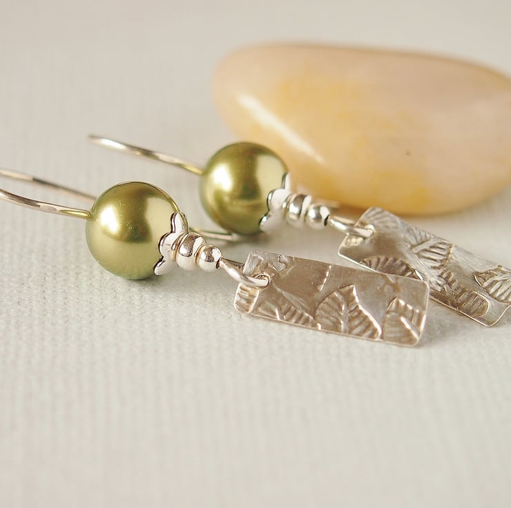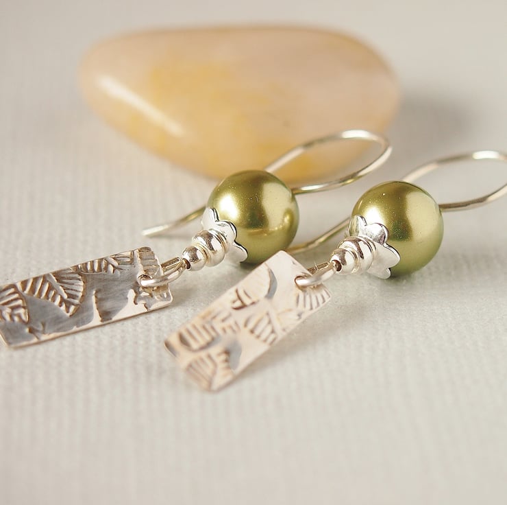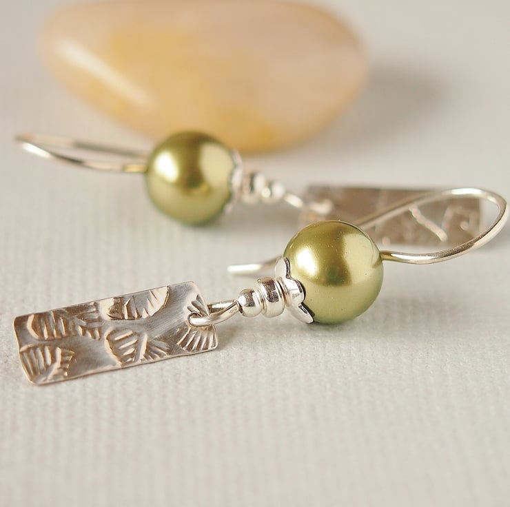 Handmade earrings featuring Light Green Swarovski pearls with leaf print serling silver drops.