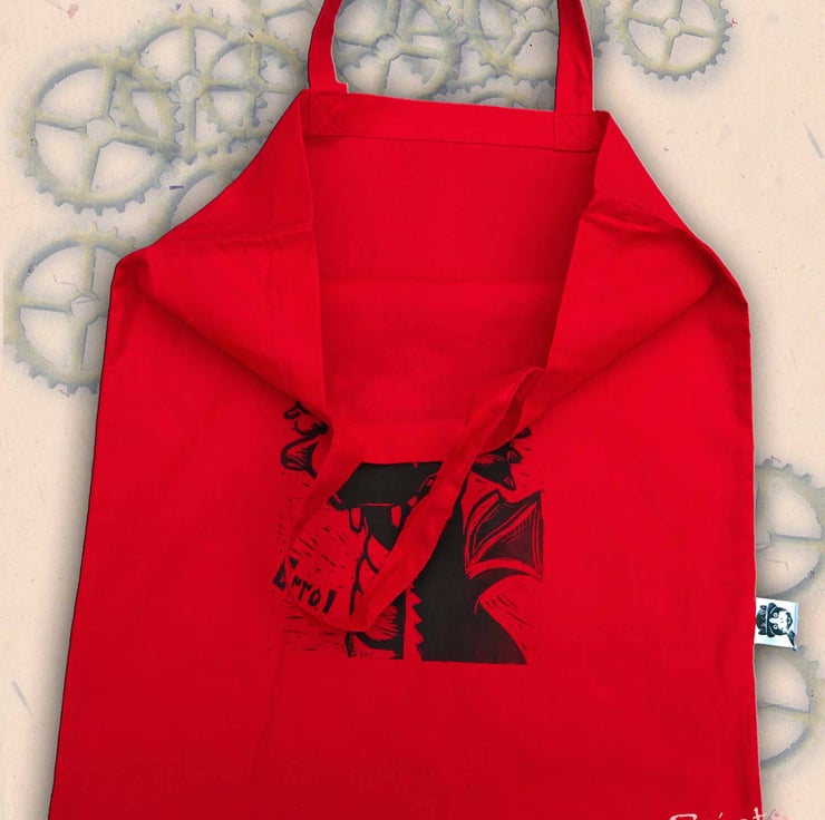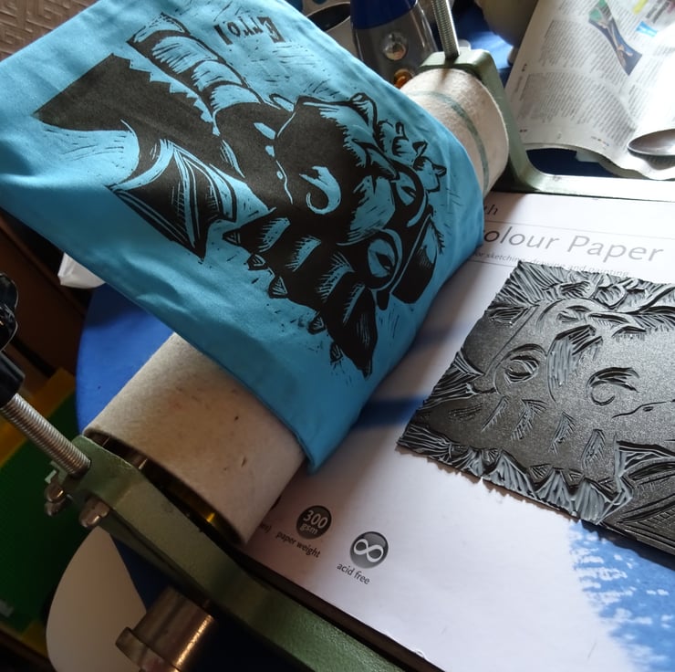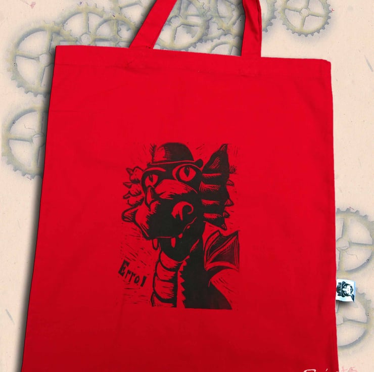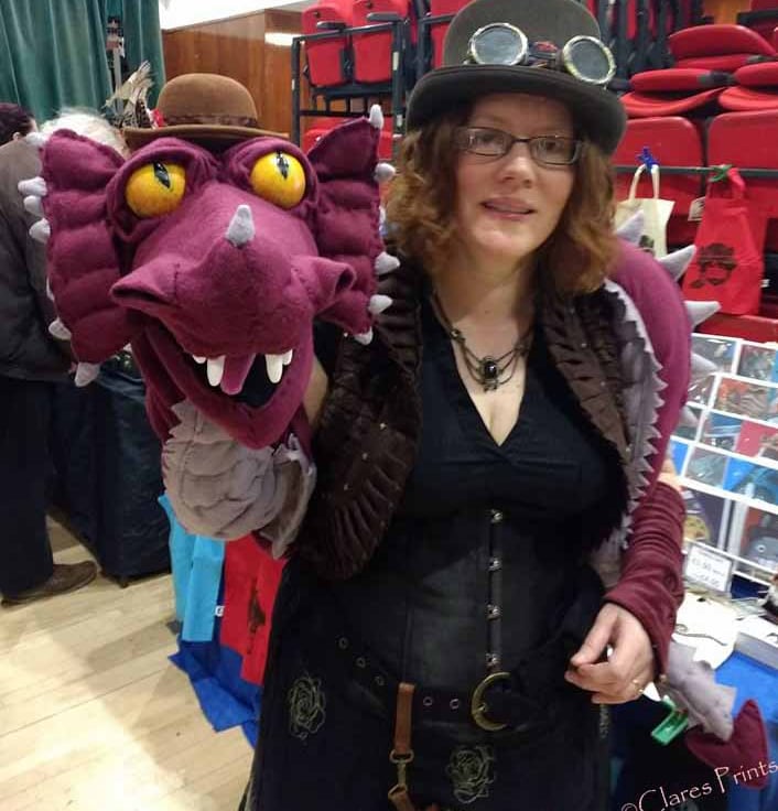 Hand printed linocut print of a Steampunk dragon in burnt umber oil based ink. This is Errol my handmade Steampunk Dragon puppet who visits lots of Steampunk events with me, as you can see in the last photo!