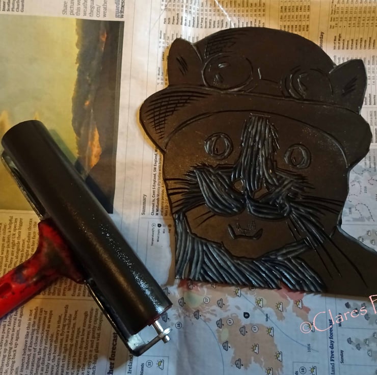 Linocut print of a cute cat in burnt Umber oil based ink.