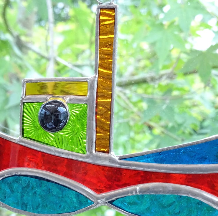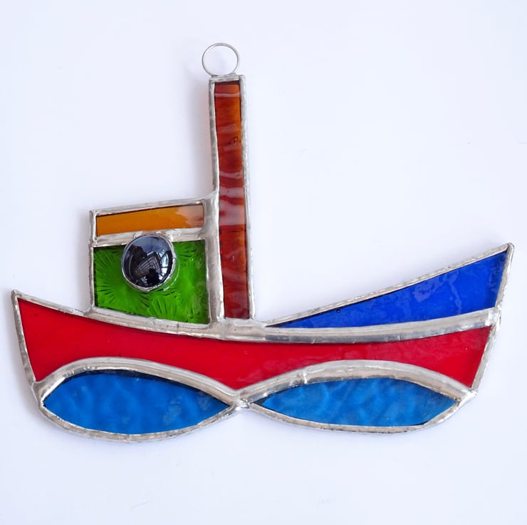 This tug has been made from vibrantly coloured stained glass and measures 15.5cms by 12cms. Each piece of glass has been hand cut, ground, copper foiled, soldered, washed and then polished. A ring has been attached for hanging purposes. It has been made from blue, red, turquoise, amber, lime and dark amber glass with a black glass nugget has been used for the porthole.